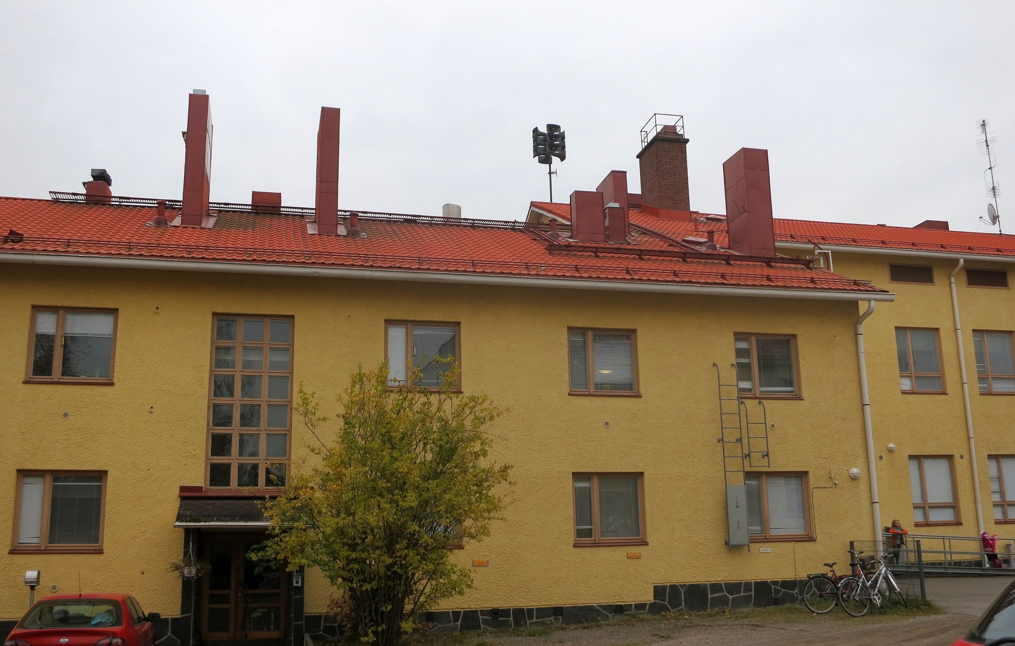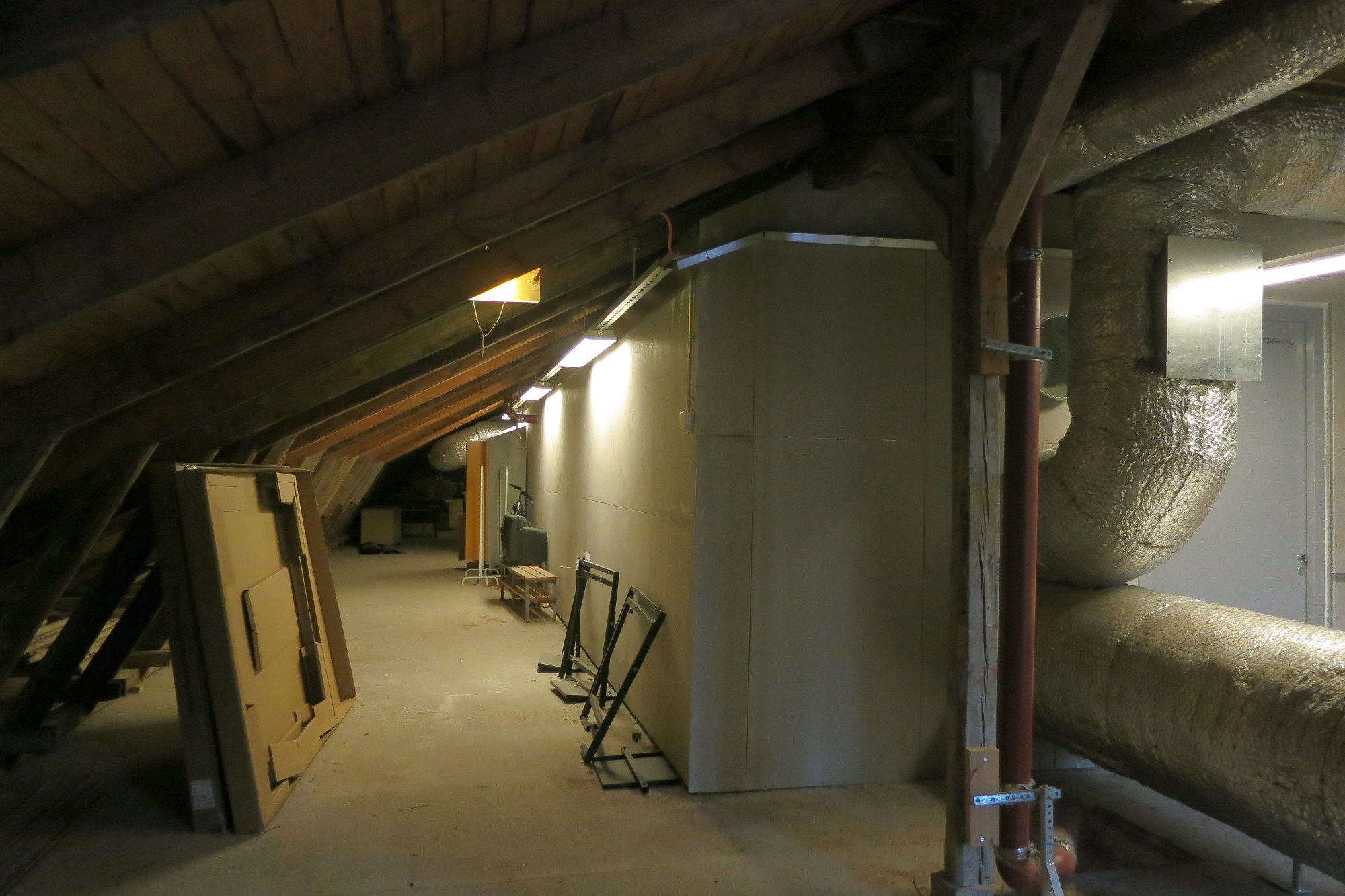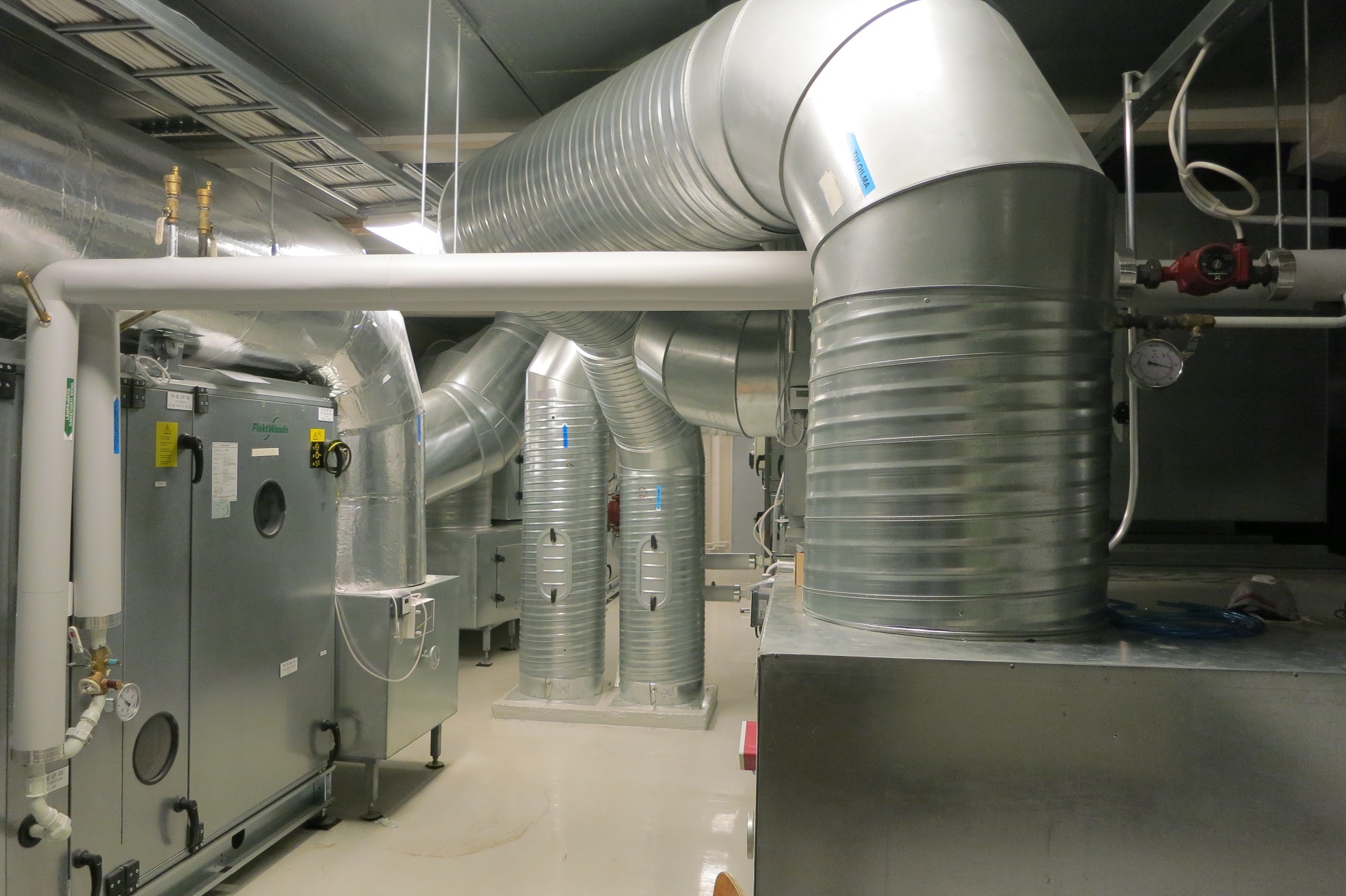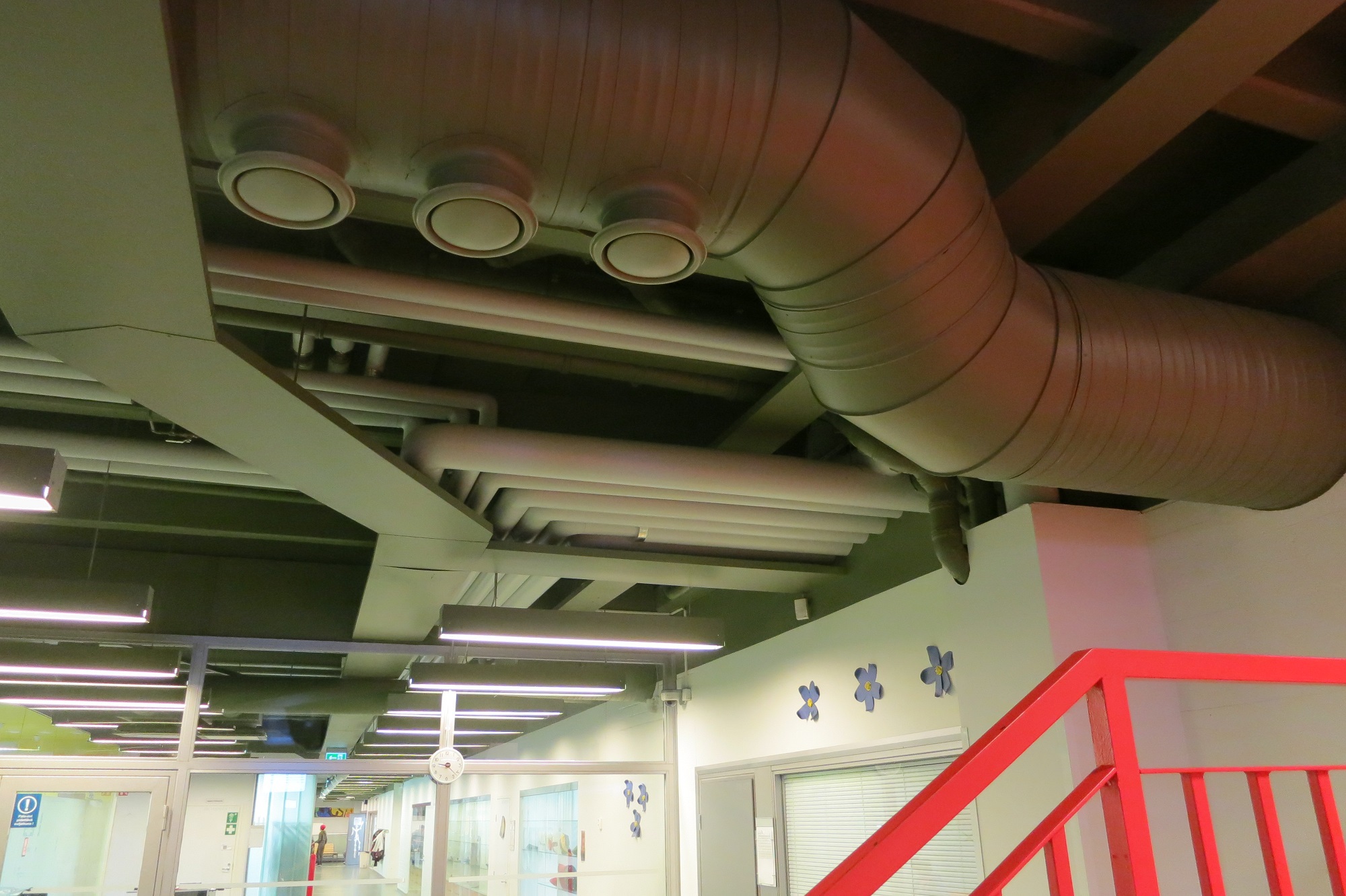 Peruskorjauksessa ilmanvaihto kanavoitiin vesikatolle asennetuilla runkokanavilla. Kattopalkit tekivät sisäpuolisen asennuksen mahdottomaksi. Kanavien alapinta olisi jäänyt alle kahteen metriin.
