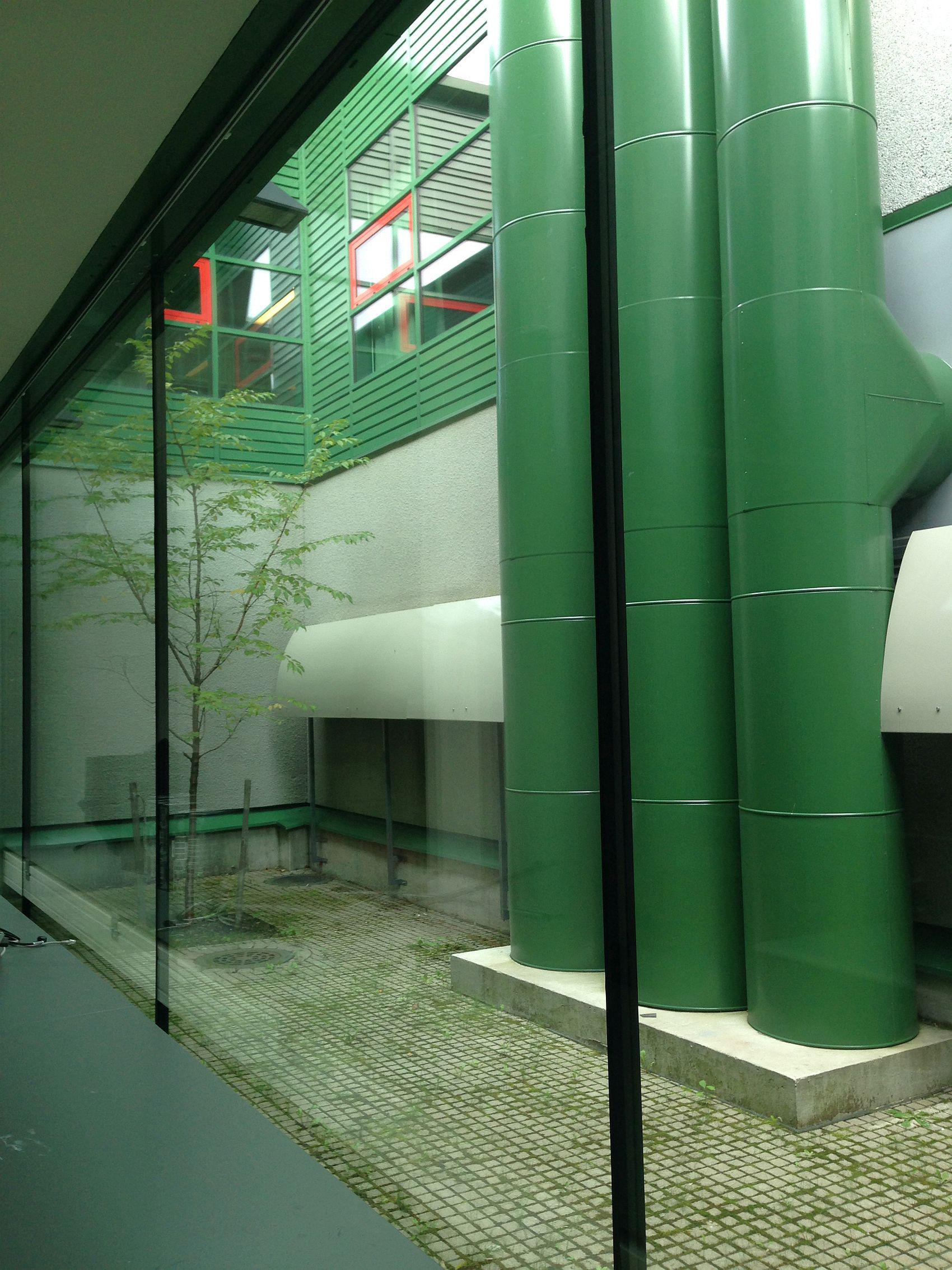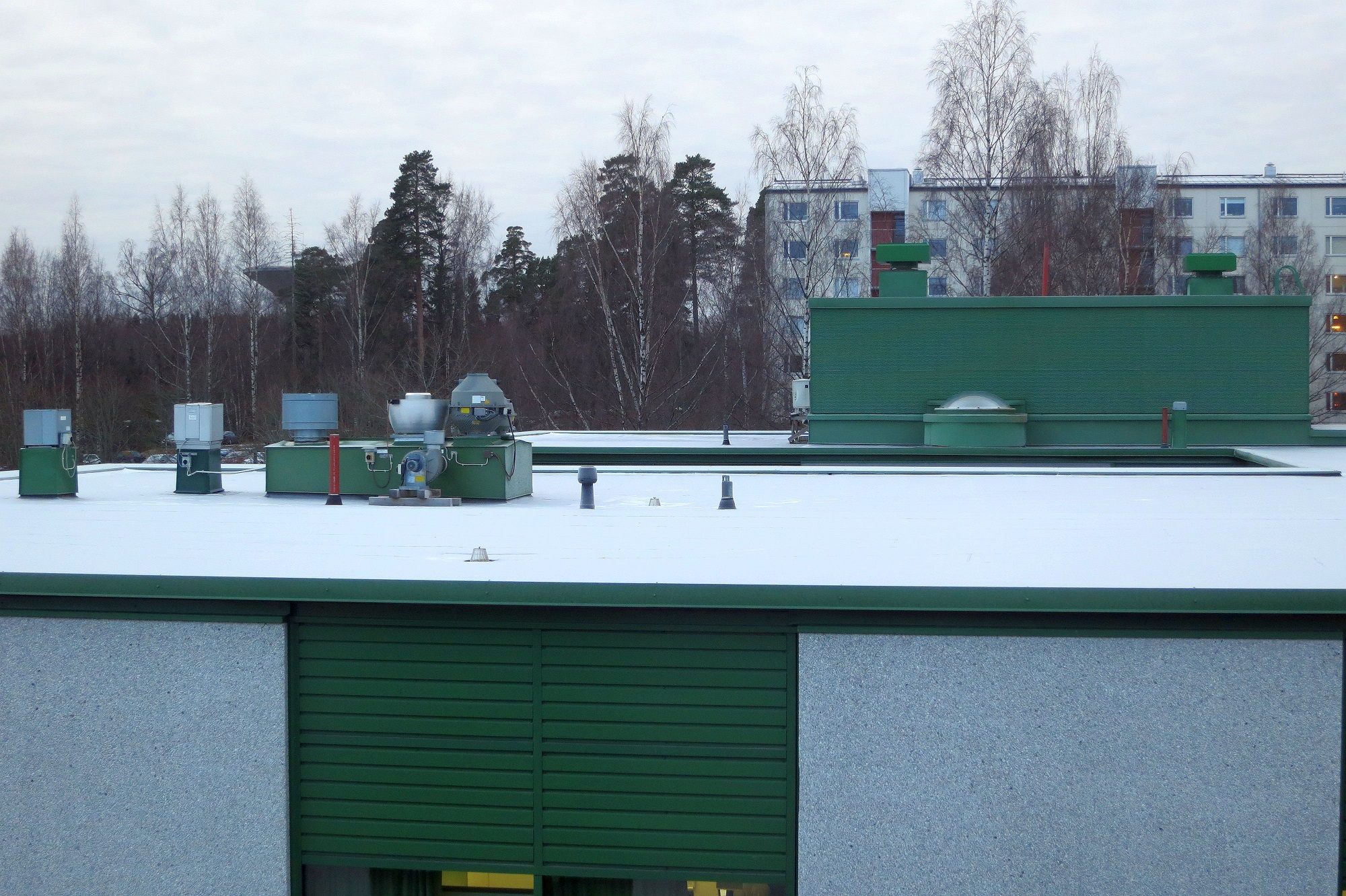 Ongelmiksi muodostuivat ilmastointikoneiden ja kanavien tilantarve ja konehuoneiden vaatima korkeus. Tästä yritettiin selvitä nostamalla vesikattoa paikallisesti tai nostamalla koko vesikatto. Lopputulos oli erikoinen, 1950-luvun kouluarkkitehtuuria kaltoin kohteleva ratkaisu. Myös jäteilman ulospuhallus- ja raitisilmapiiput toivat uuden poikkeavan lisänsä perinteisten piippujen sijaan ja rinnalle. Rakennuksen viides julkisivu on vesikatto, joka jäi näissä käänteissä ilman esteettistä valvontaa. Toisinkin olisi voitu menetellä. Rakennuksen valmistumisaikakauden tuotteita olisi ollut saatavilla ja uusien laitteiden verhoilu entisten piippujen mallisiksi olisi ollut mahdollista. Hajautetulla konehuonesijoittelulla olisi voitu välttää hurjimmat muutokset vesikatolla.