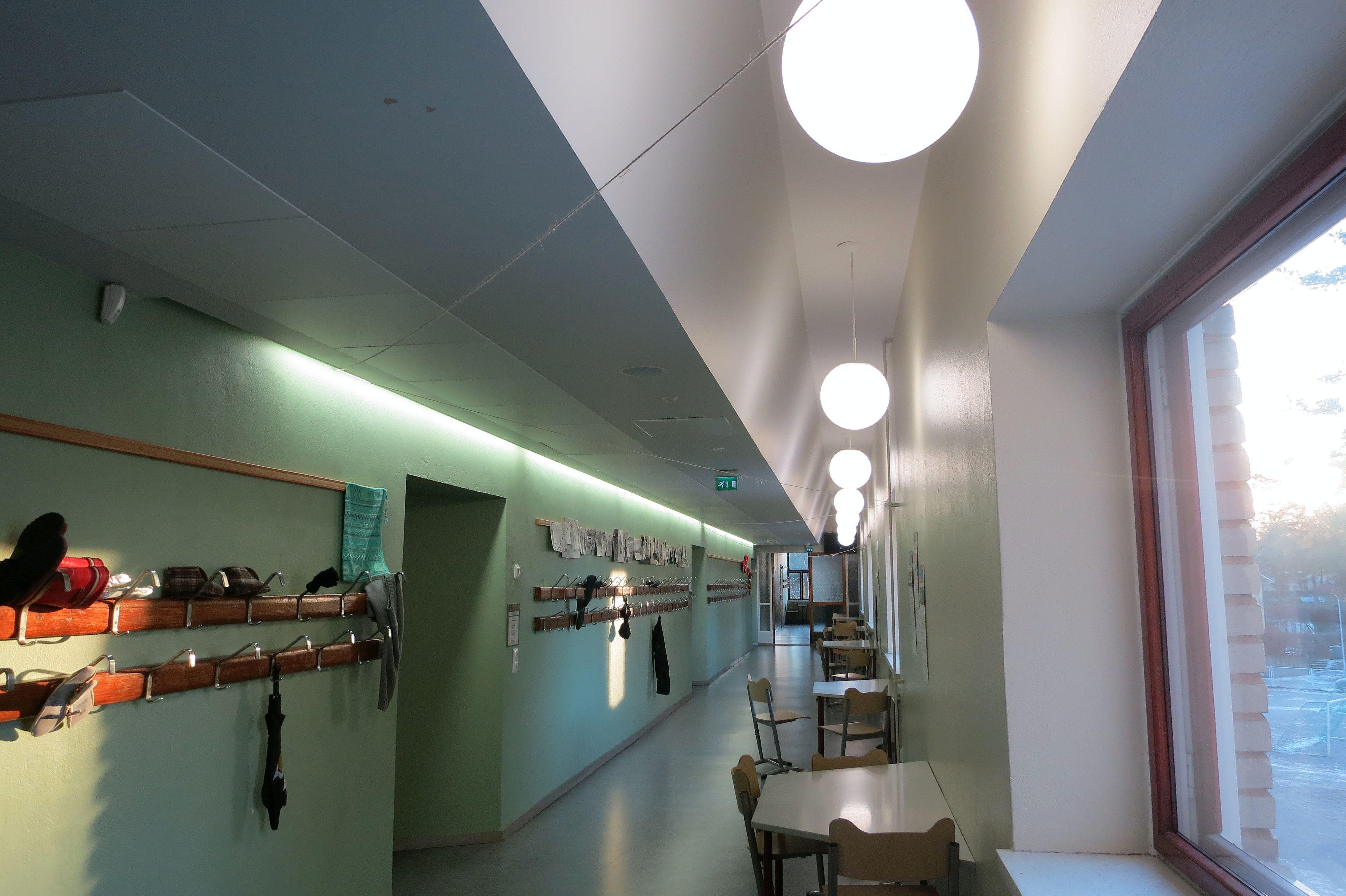 Right: Rekolan koulun luokkakäytävän alakatto laskee kahdessa vaiheessa. Kuva: Jukka Sainio.