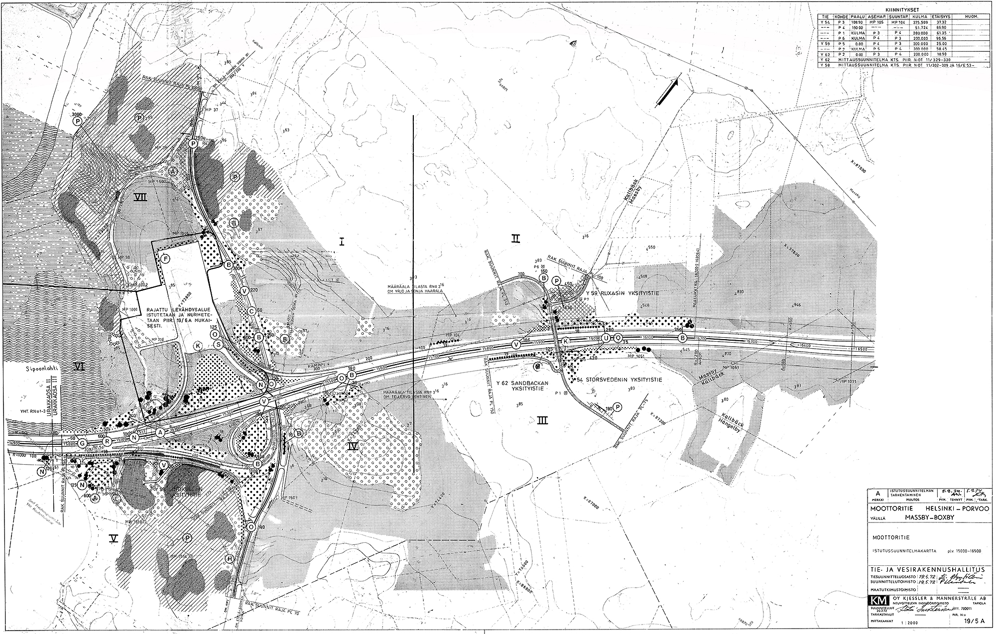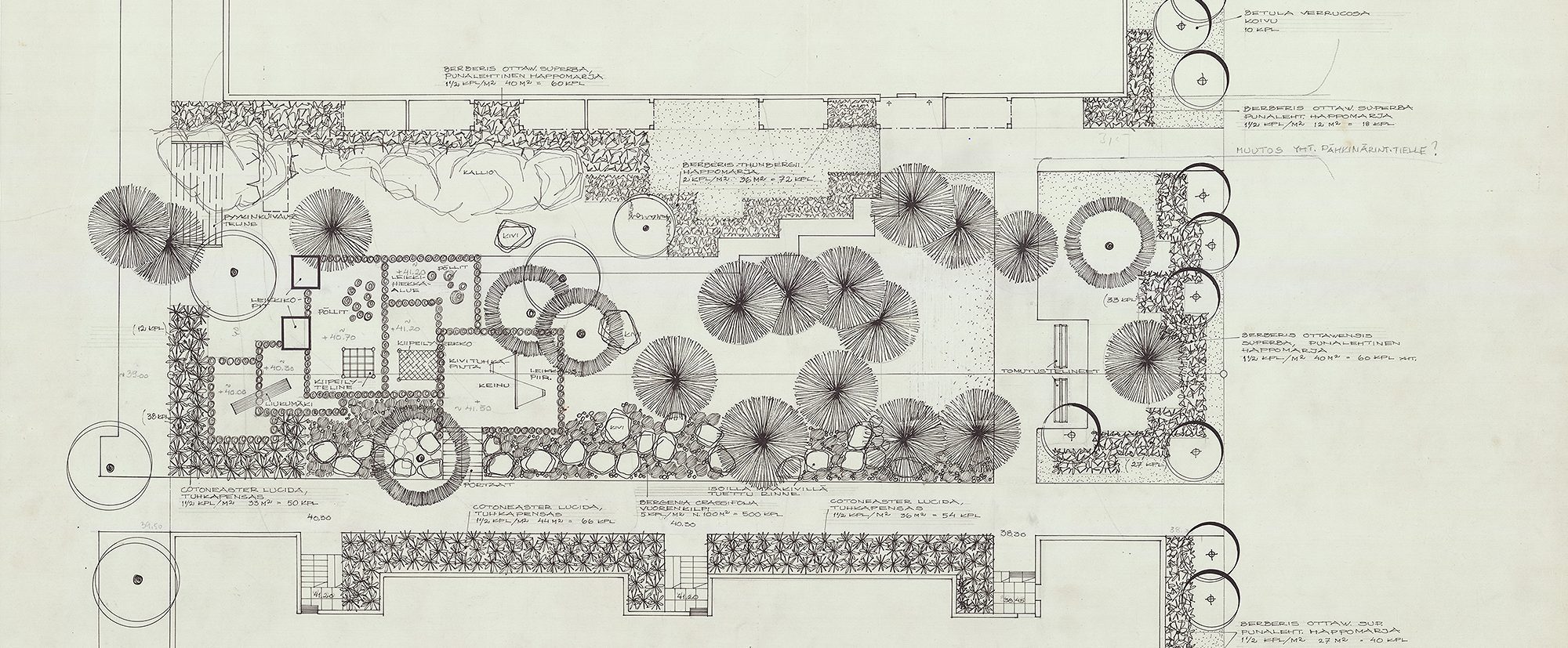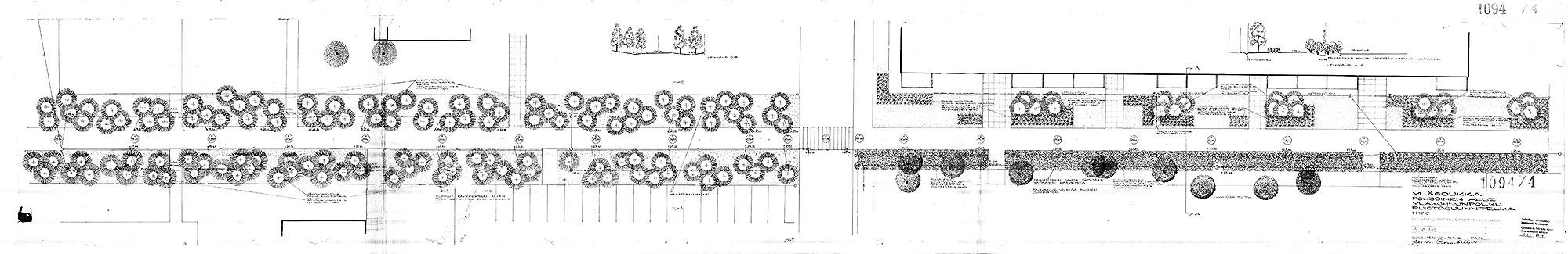 Right: Katri Luostarisen istutussuunnitelma Helsinki–Porvoo-moottoritielle, välillä Massby–Boxby vuodelta 1972. Moottoritiet ja infrastruktuurin ympäristöt tulivat 1970-luvulla maisema-arkkitehtuurin uusiksi tehtäviksi. Arkkitehtuurimuseo.