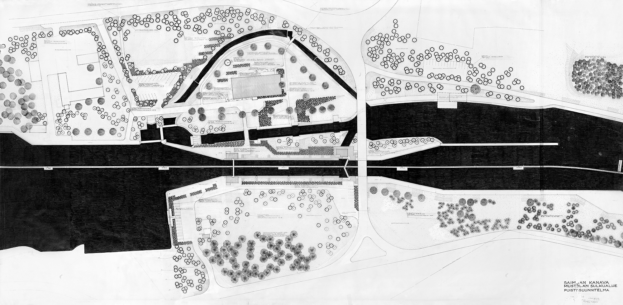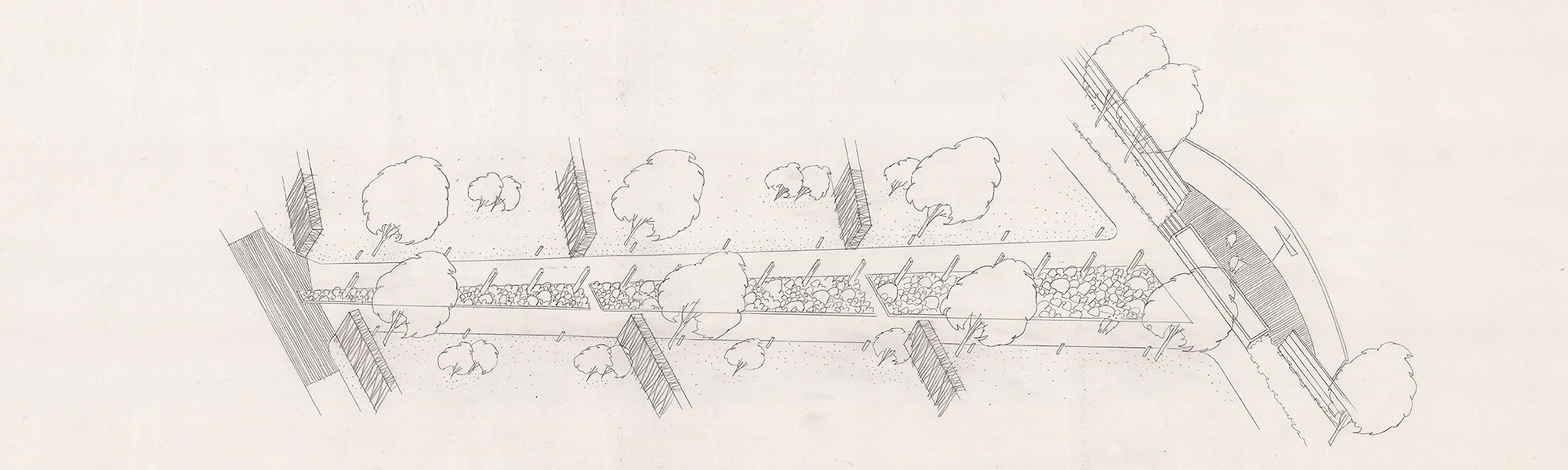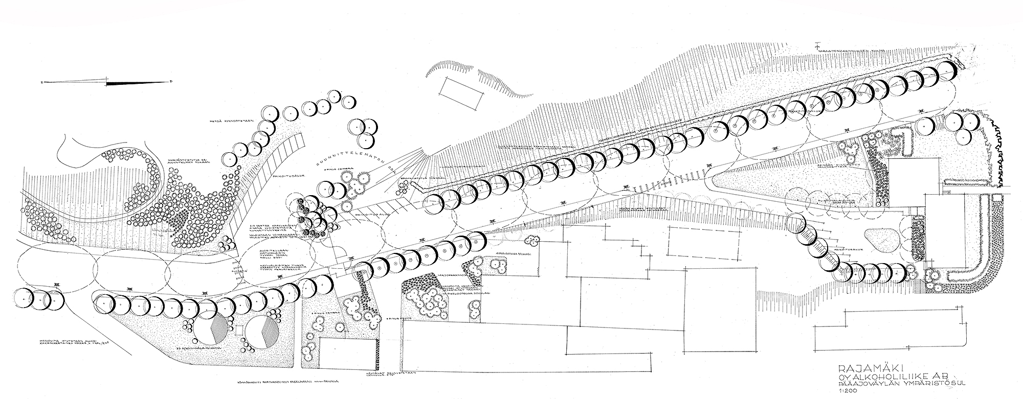Right: Katri Luostarisen istutussuunnitelma Helsinki–Porvoo-moottoritielle, välillä Massby–Boxby vuodelta 1972. Moottoritiet ja infrastruktuurin ympäristöt tulivat 1970-luvulla maisema-arkkitehtuurin uusiksi tehtäviksi. Arkkitehtuurimuseo.
