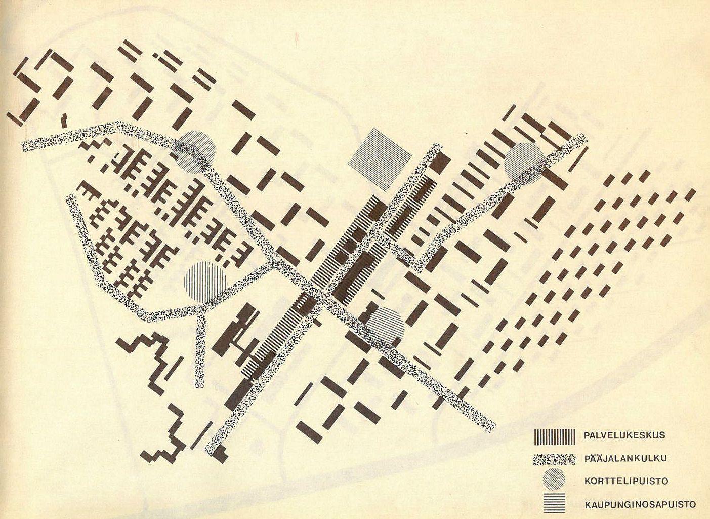 [KUVA 3. Ollinsaaren lähiön periaatekaavio vuoden 1972 rakennuskaavasta.]