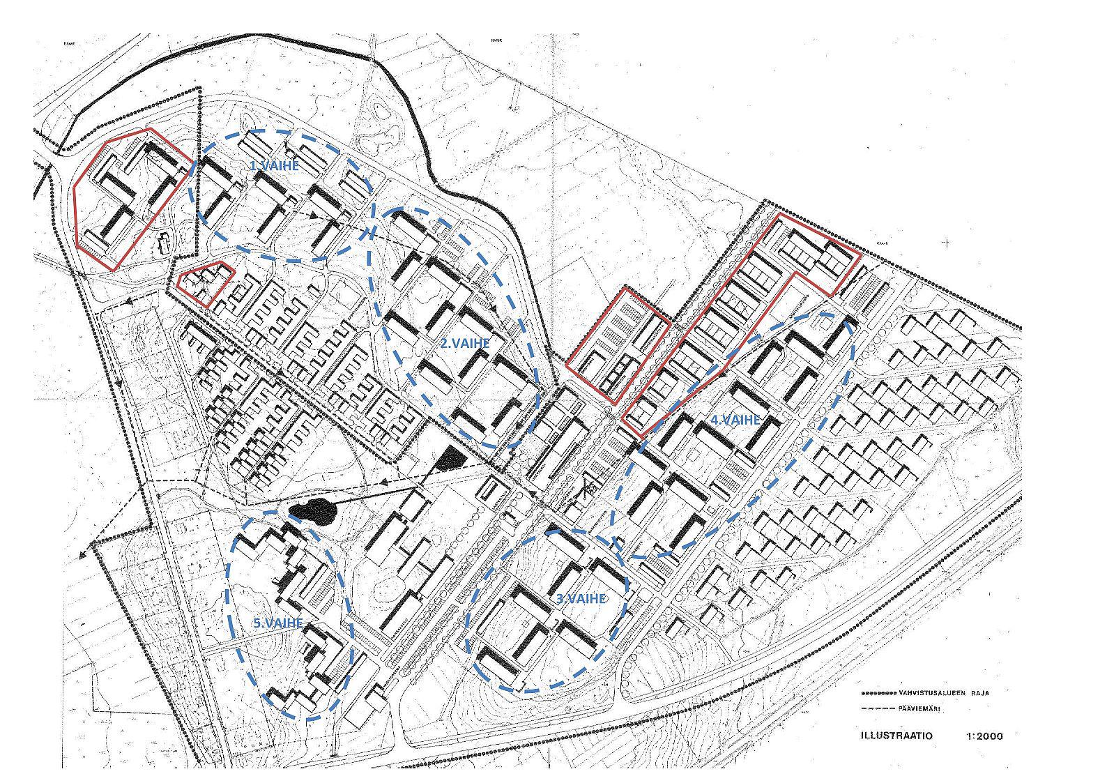 [KUVA 4. Ollinsaaren rakennuskaavan illustraatiokuva. Punaisella viivalla on rajattu toteutumattomat korttelit. Sinisellä katkoviivalla on esitetty asuinkerrostalojen viisi rakentamisvaihetta.]