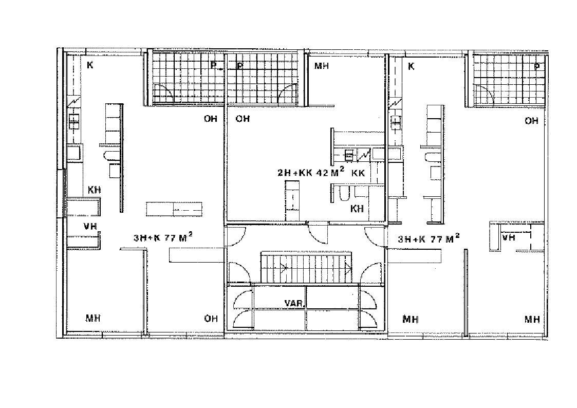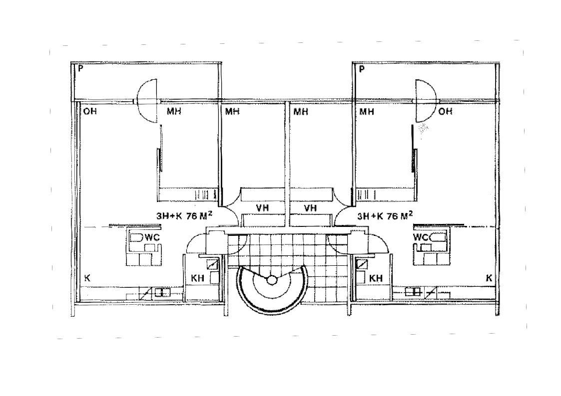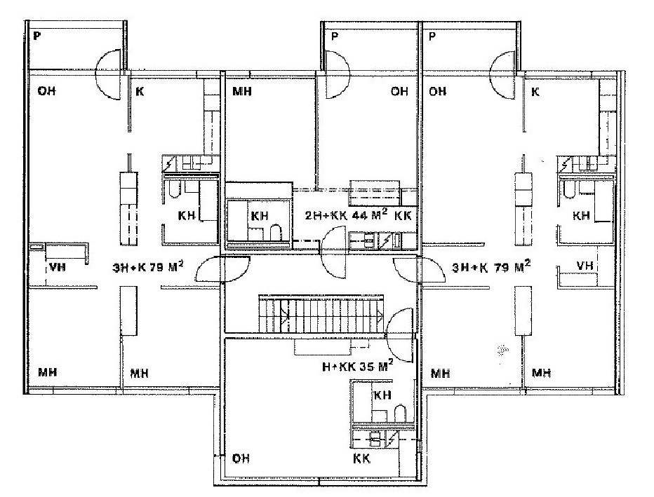 [KUVA 7. Ensimmäisen vaiheen (1967) pienkerrostalolamellin pohjapiirros. Kuva: Arkkitehti 1977/7.]