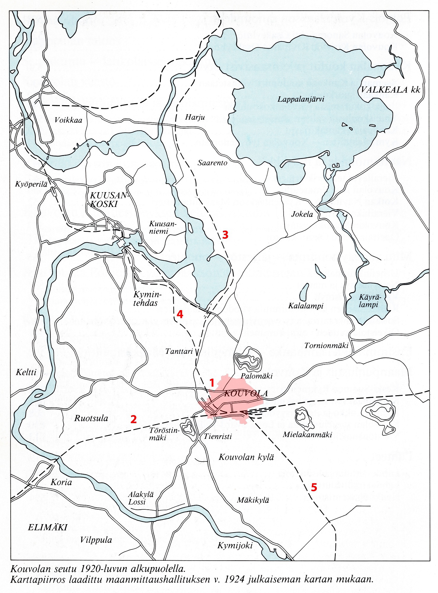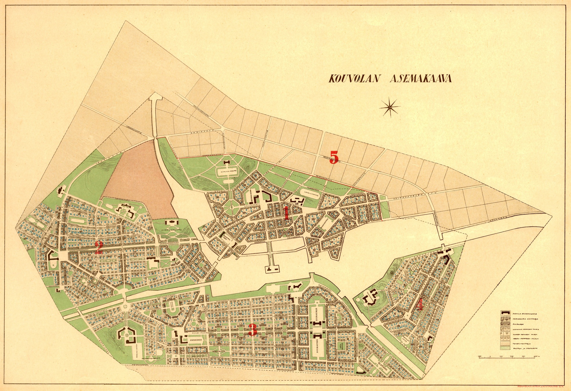Kouvolan ensimmäinen asemakaava vahvistettiin 1922. Se laadittiin 1919 järjestetyn asemakaavakilpailun pohjalta. Kilpailun voittivat arkkitehdit Jussi ja Toivo Paatela.[5] Kouvola muuttui kauppalaksi 1923.[6]