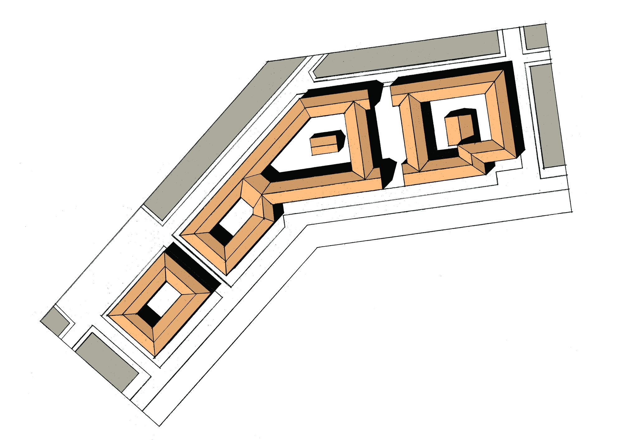 _Oik.: Vuoden 1948 asemakaava hajottaa yhtenäiset rakennusrintamat kolmiulotteiseksi kompositioksi. Havainnepiirrokset: Rurik Wasastjerna.