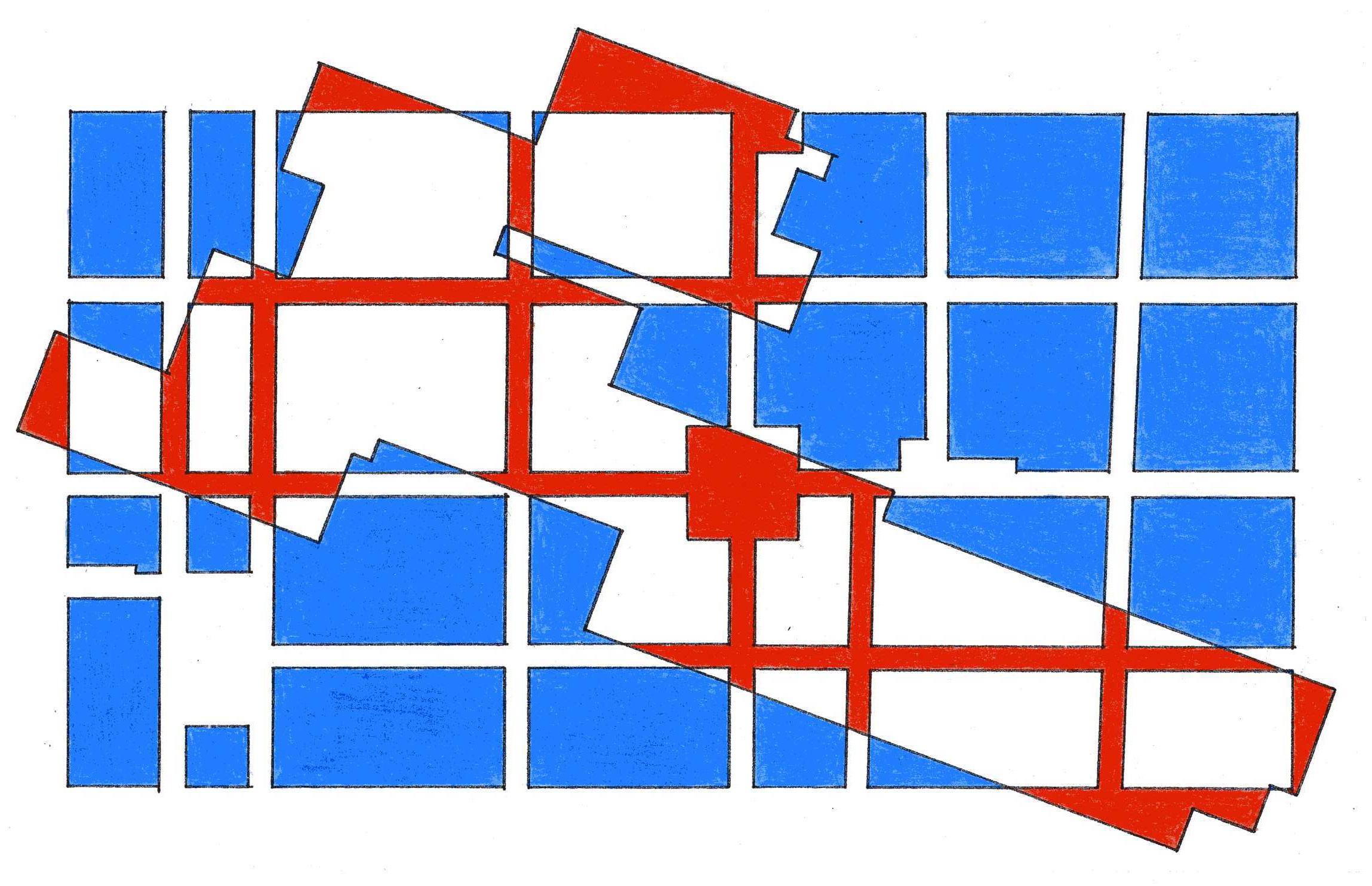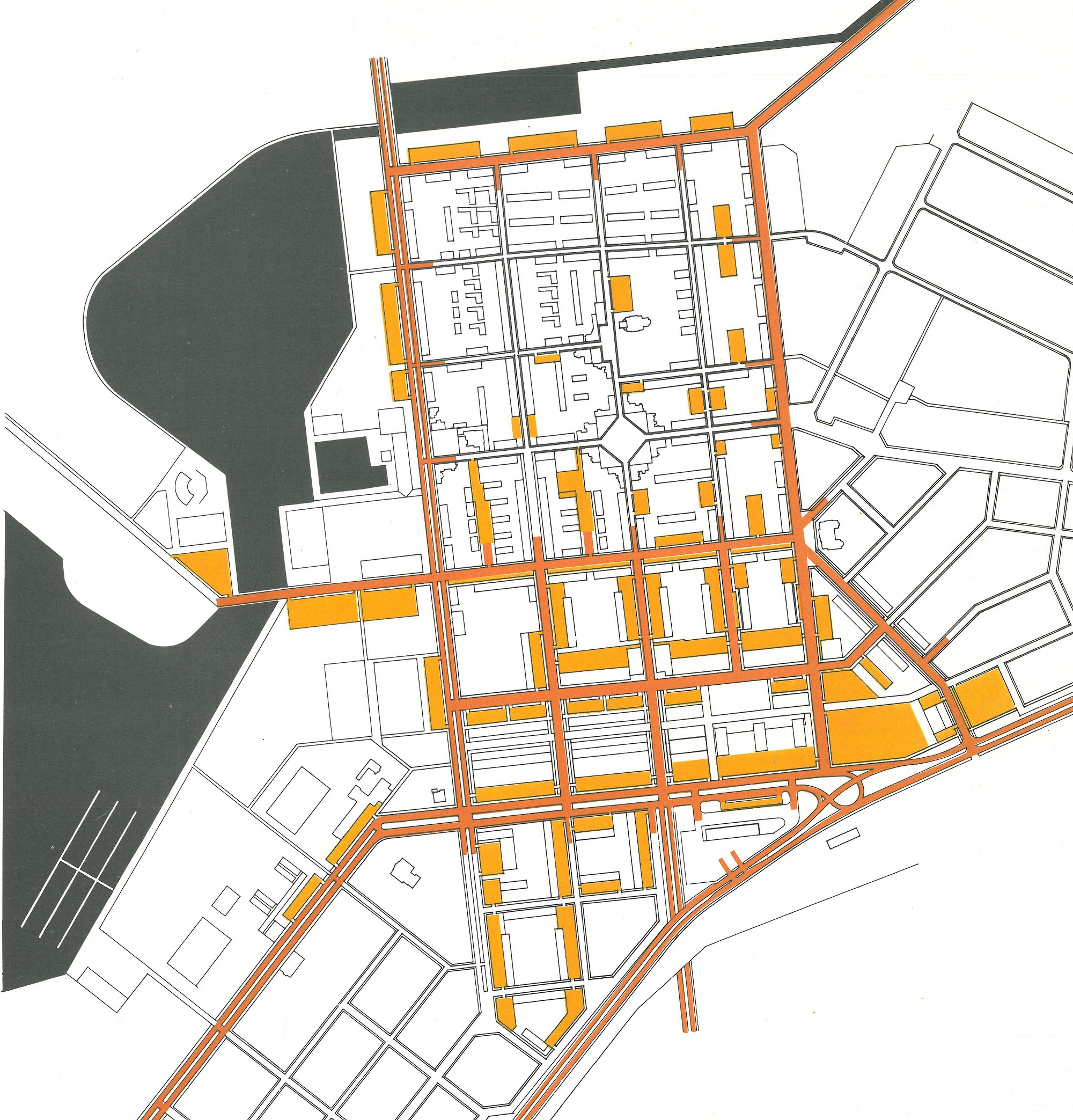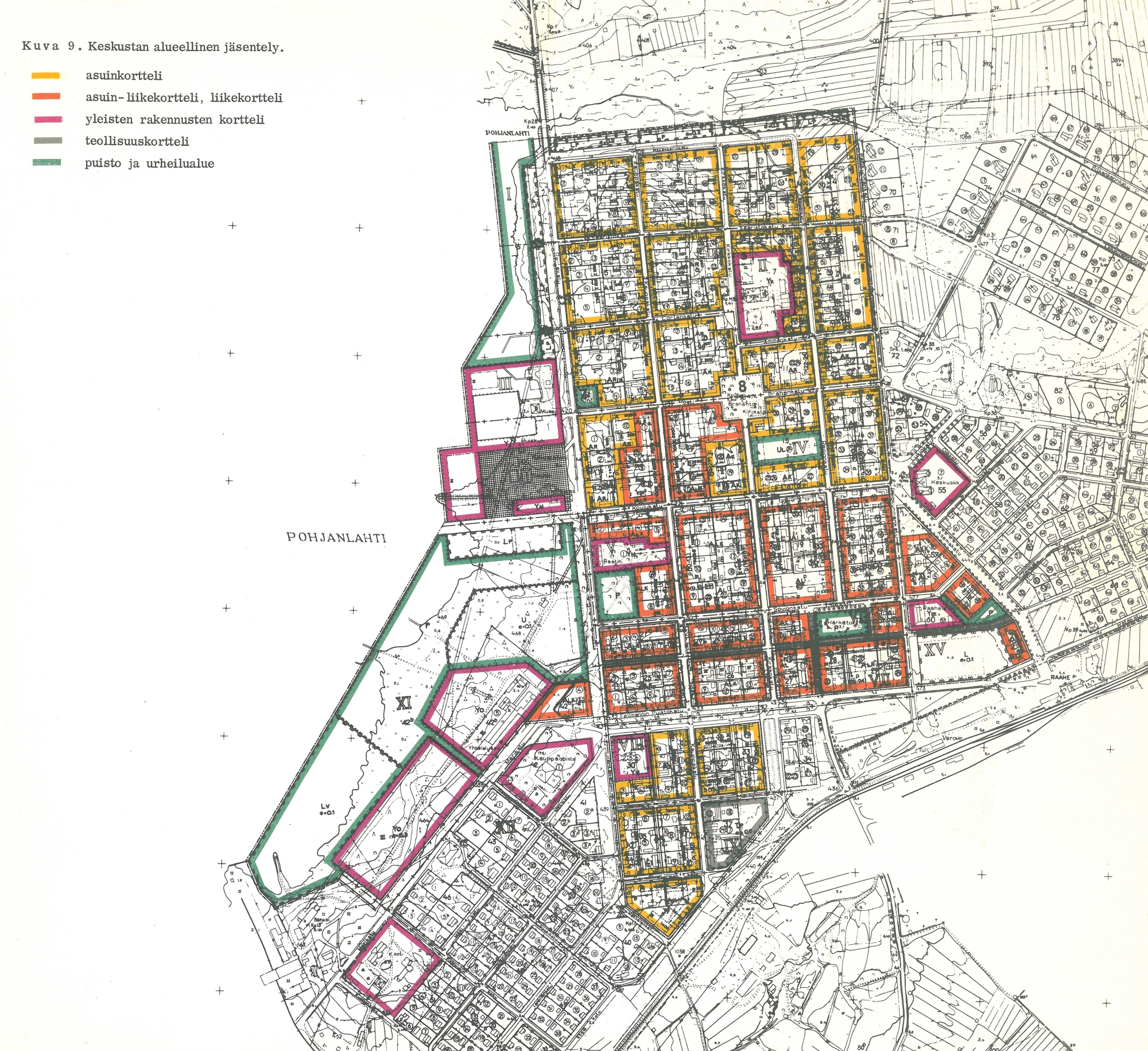 [KUVA 05_ Raahen keskustan vuonna 1967 vahvistuneen asemakaavan alueellinen jäsentely, jossa vanha puukaupunki jaettiin toiminnallisesti eriytyneisiin korttelialueisiin.]