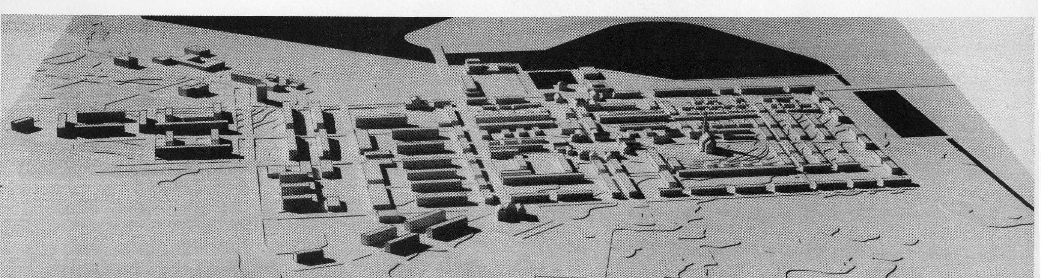 [KUVA 1. Pienoismalli, joka kuvaa Ahti ja Esko Korhosen sekä Erik Kråkströmin Raahen keskustan ruutukaava-alueen saneeraussuunnitelmaa idästä katsottuna.]