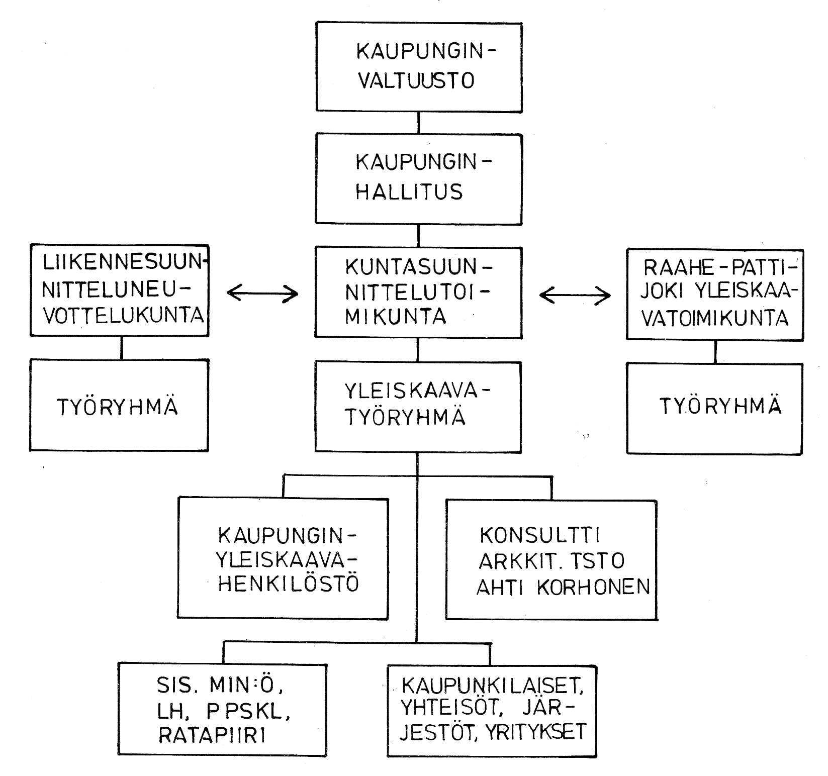 [KUVA 2. Raahen vuoden 1979 yleiskaavan suunnitteluorganisaatio. Lähde: Raahen yleiskaava 1979, 7.]