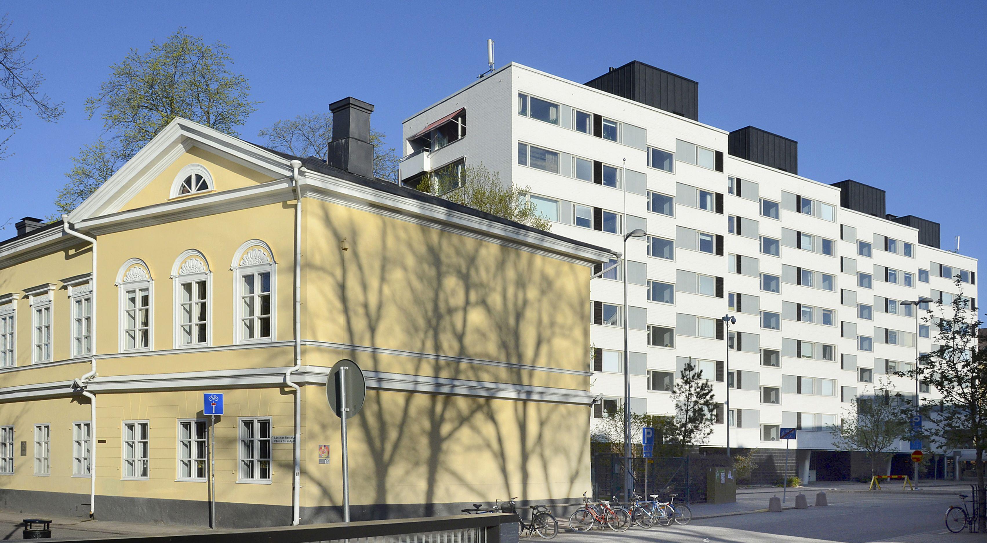 Kuvasarja rinnastaa 1950-luvun arkkitehtuurinäkemyksiä. Kuvat: Turun kaupunki Kaupunkisuunnittelutoimiala, Samuli Saarinen. Kuva 1: As Oy Turun Puistokatu 3 (arkkitehti Olli Kestilä 1955). Kadun varren matalat rakennusosat on sovitettu puutalokaupungin mittakaavaan. Kuva 2: Ns. Puolimatkan tornit, As Oy Puutarhakatu 11-13, ovat keskustan korkeimmat liukuvalurunkoiset, 14-kerroksiset rakennukset (arkkitehdit Aarne Ehojoki ja Veijo Kahra 1956-57). Kadun toisella puolella 1980-luvun uudisrakennus suojellun ns. Leninintalon vierellä. Kuva 3: As Oy Eerikinportin 11- ja 7-kerroksisia asuintaloja yhdistää matala liikesiipi kadun varrella (Kaupungin Talonrakennusosasto, kaupunginarkkitehti Abel Sandelin, 1954-55).