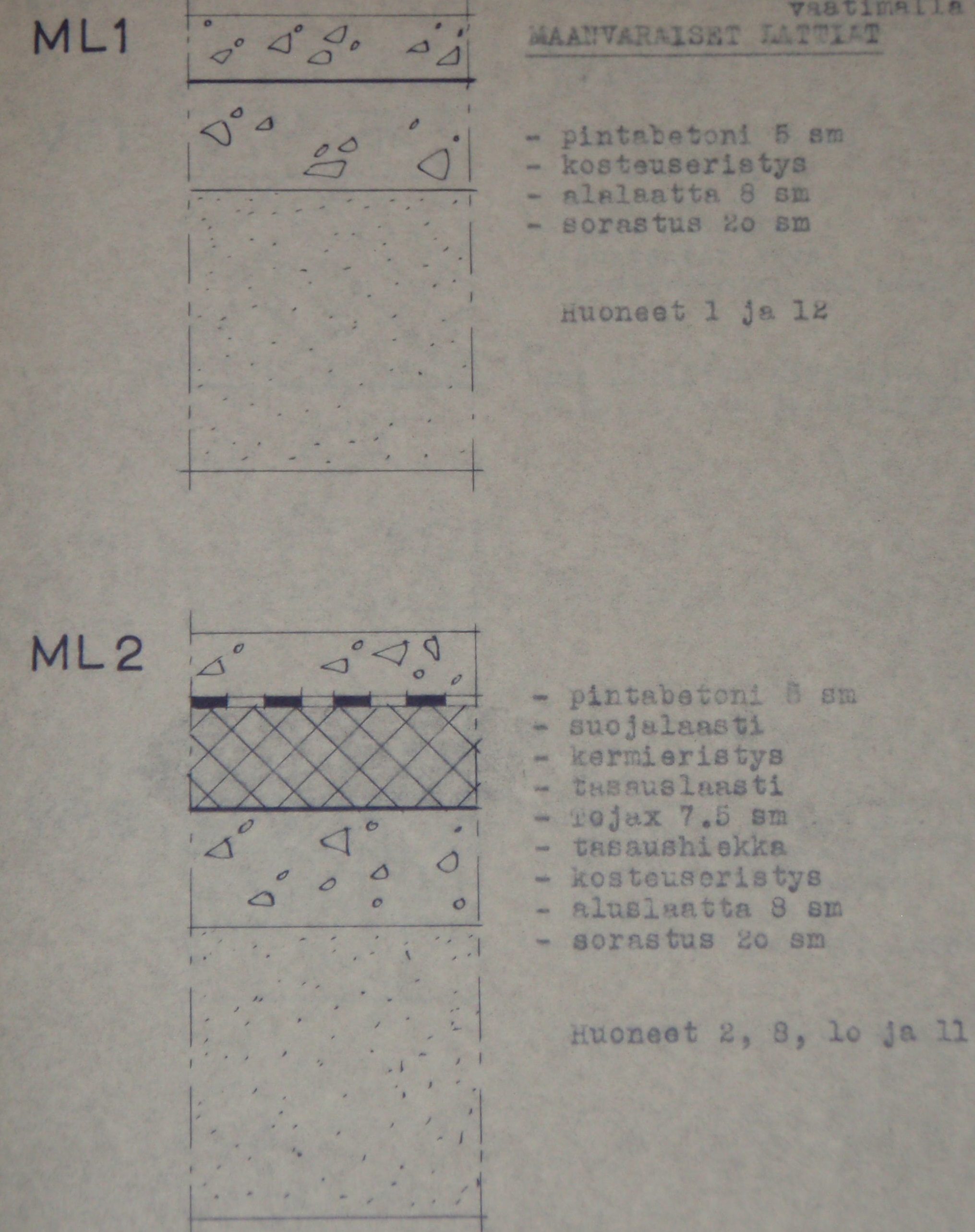 Maanvaraisissa alapohjissa käytettiin tyypillisesti pohjalaatan yläpintaan tehtyä bitumisivelyä kosteuseristeenä. Jos kyse oli lämpimäksi aiotusta tilasta, lämmöneristeenä käytettiin yleisimmin kevytsoraa tai sementistä ja puulastuista valmistettuja lastuvillalevyjä. Kellarikerroksissa alapohjat jätettiin usein kokonaan eristämättä. Veistoluokkien ja liikuntasalien lattioissa käytettiin myös yleisesti betonilaatan päälle tehtyjä puukoolausrakenteita.