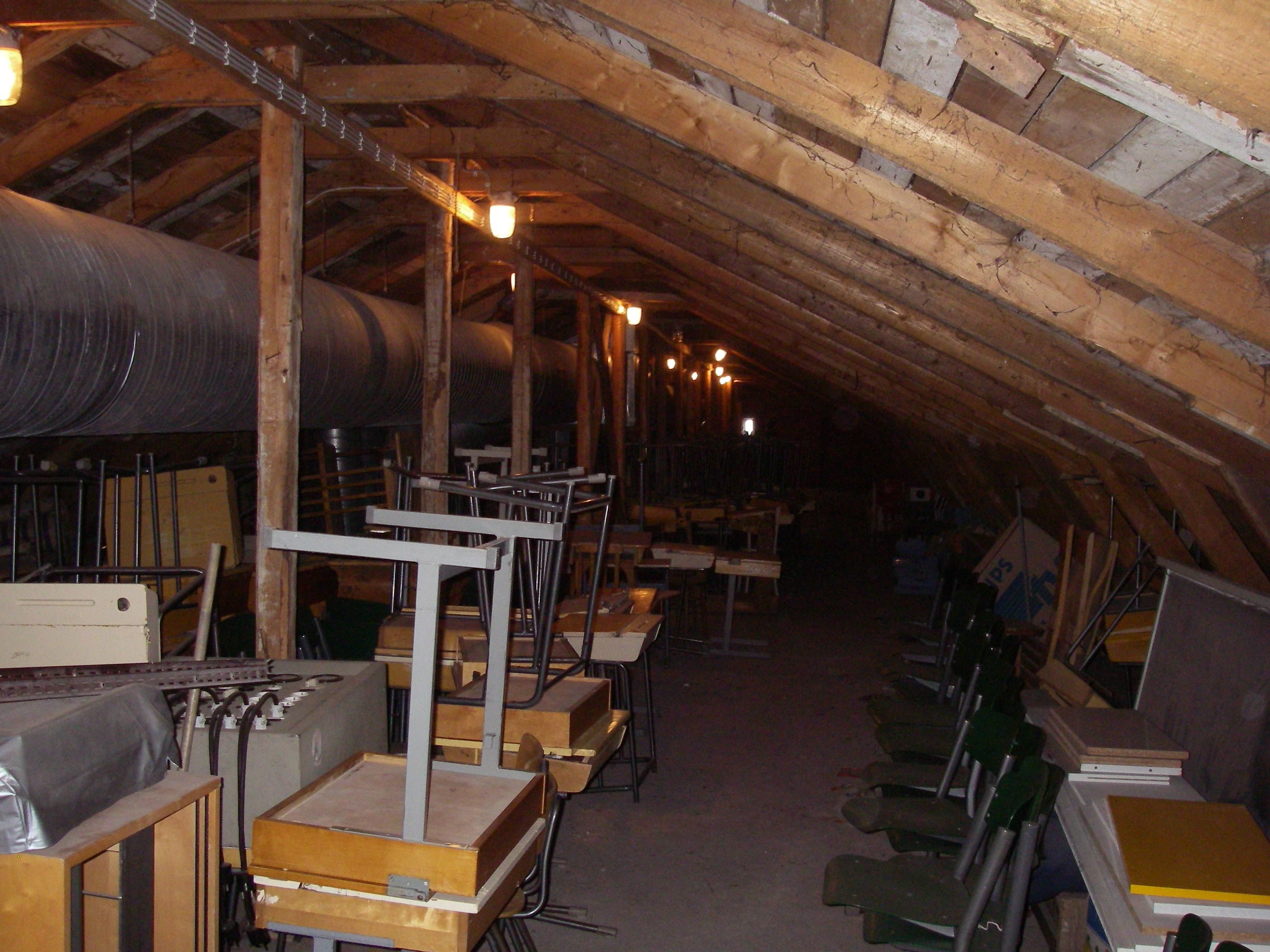 Koulurakennuksissa oli yleisesti harjakatto, ja ullakkotila oli varastokäytössä. Yläpohja oli rakenteeltaan useimmiten alalaattapalkisto, koska se mahdollisti lämmöneristyksen sijoittamisen rakenteen sisään. Yläpuolella käytettiin 1950-luvulla useimmiten betonista palopermantoa, joka toimi myös ullakkotilan lattiana. Palopermanto estää tulipalon leviämisen ullakkotilan kautta rakennuksen eri osien välillä. Se muotoiltiin niin, että tulipalon sammutusvedet valuivat hallitusti pois seinälle muurattujen tiiliruukkuputkien kautta. Ullakkotilat ovat myöhemmin mahdollistaneet ilmanvaihtokonehuoneen tekemisen olemassa olevan rakennuksen sisään ja ullakon käytön ilmanvaihtokanavien asennukseen. Vesikatto oli lähes aina puurakenteinen, ja katemateriaalina käytettiin 1950-luvulla lähinnä tiili- ja peltikatteita.