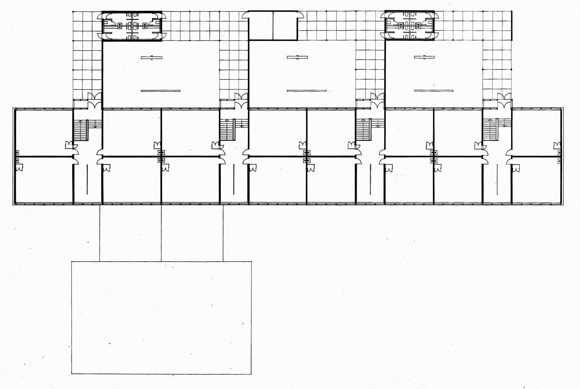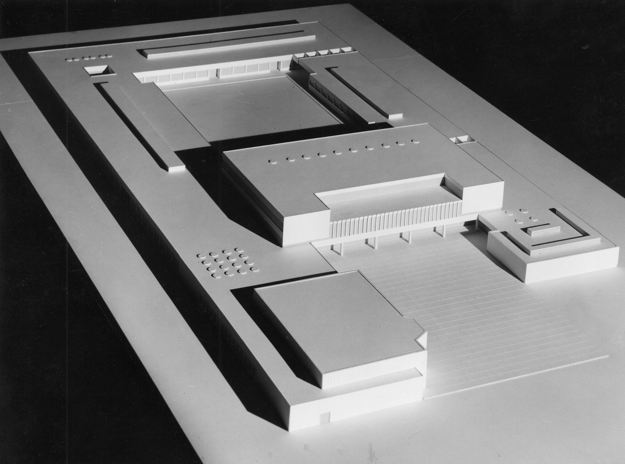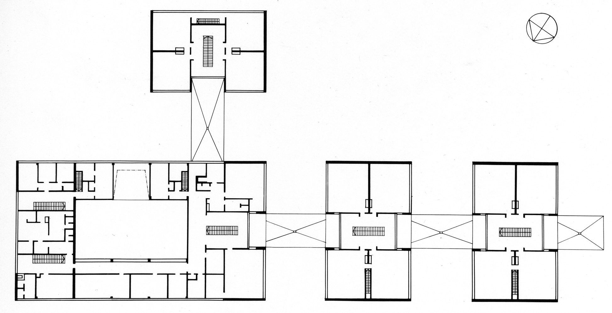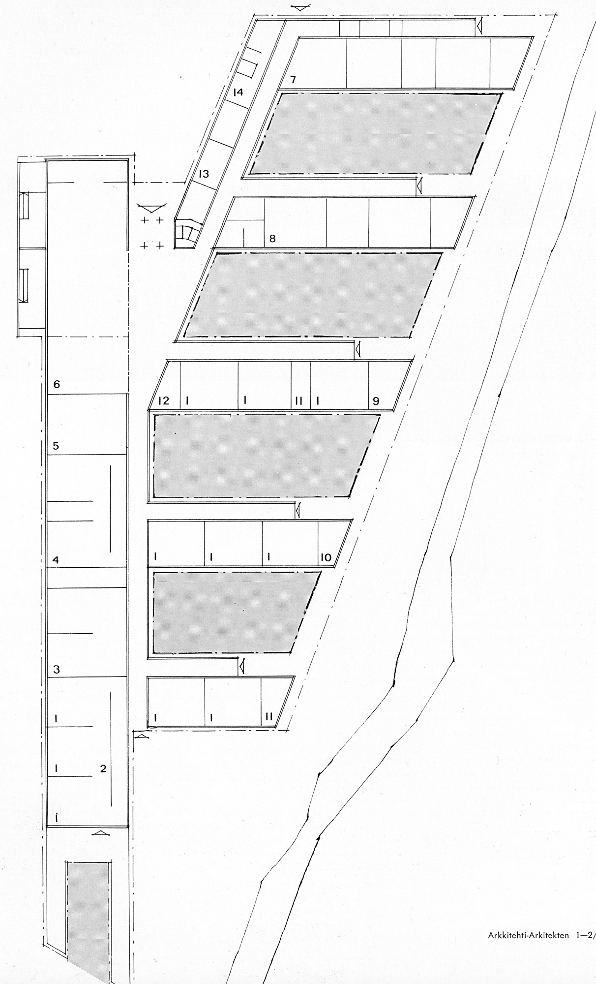 _Oik.: Pohjapiirroksesta näkyy, miten koulurakennus on jäsennelty eri luokka-asteille tarkoitettuihin paviljonkeihin. Koulun pihat ryhmittyvät vastaavasti paviljonkien ympärille. Kuva: Arkkitehtuurimuseo.