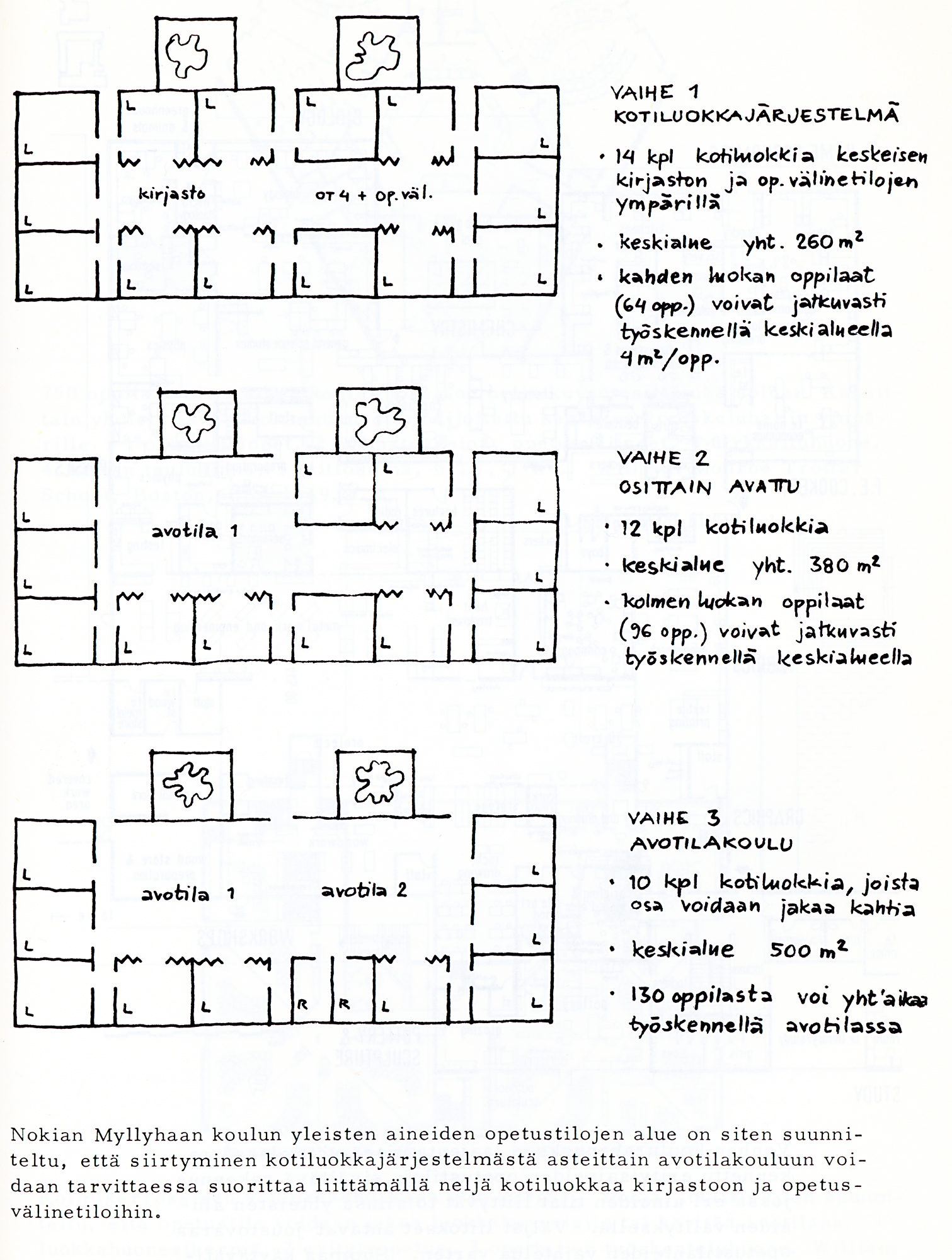 Kun Suomessa 1970-luvun alussa alettiin siirtyä uuteen peruskoulujärjestelmään, otettiin mallia Ruotsista, jossa oli siirrytty peruskouluun 1960-luvun lopussa. Vuonna 1971 perustettiin tutkimusryhmä, joka Suomen itsenäisyyden juhlarahasto Sitran tuella selvitti koulusuunnittelun kehittämistä. Myös meillä haluttiin suunnitella 1970-luvun uudet koulut palvelemaan uusia opetusmenetelmiä ja hyödyntää koulujen suunnittelussa sekä kasvatustieteilijöiden että arkkitehtien näkemykset.[3]