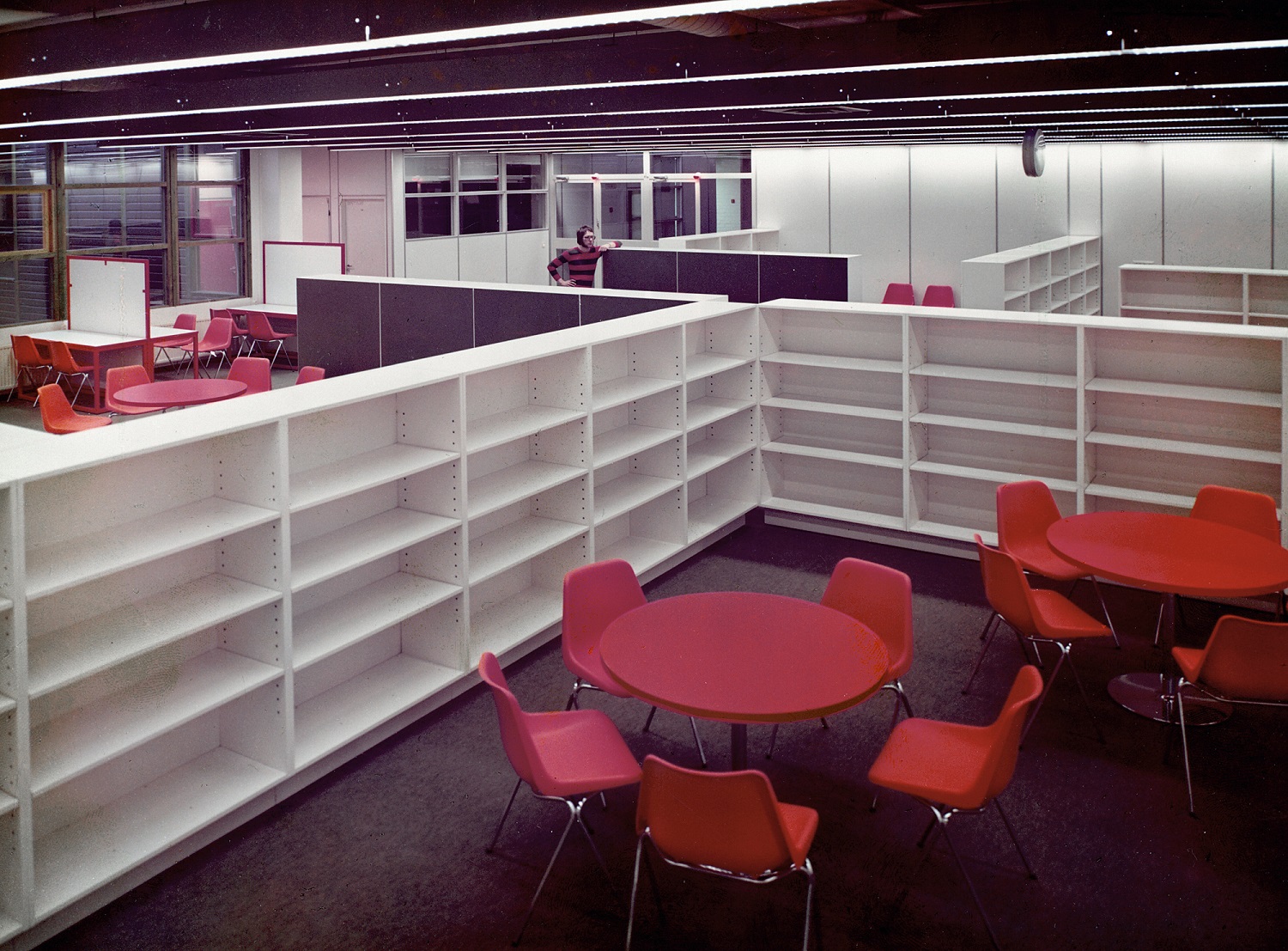 Arno Savela: Martinlaakson koulu, Vantaa 1974–1976. Koulun mediateekki. Kuva: Arkkitehtuurimuseo.