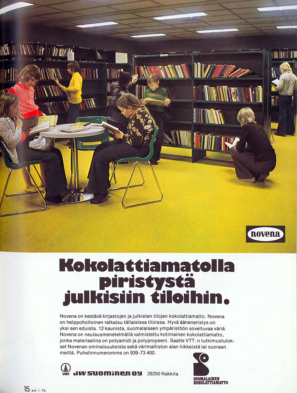 Kouluissa käytettiin kokolattiamattoja parantamaan akustiikkaa. Kuvalähde: Novenan mainos Arkkitehti-lehdessä 1/1976.
