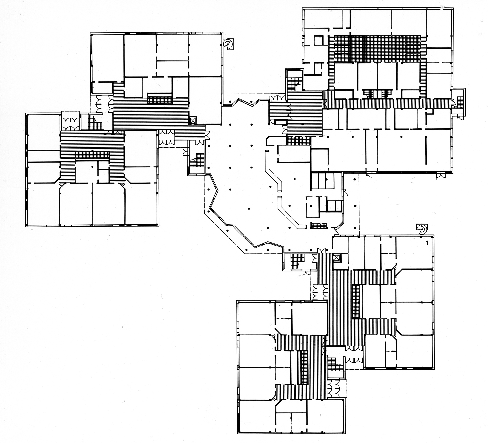 Björn Krogius: Turun Normaalikoulu, Turku 1978–1980. Pohjapiirustuksesta käy ilmi solukoulun periaate. Kuva: Arkkitehtuurimuseo.