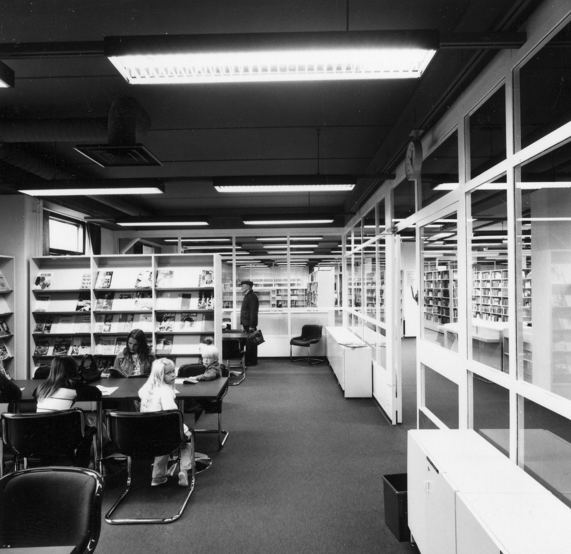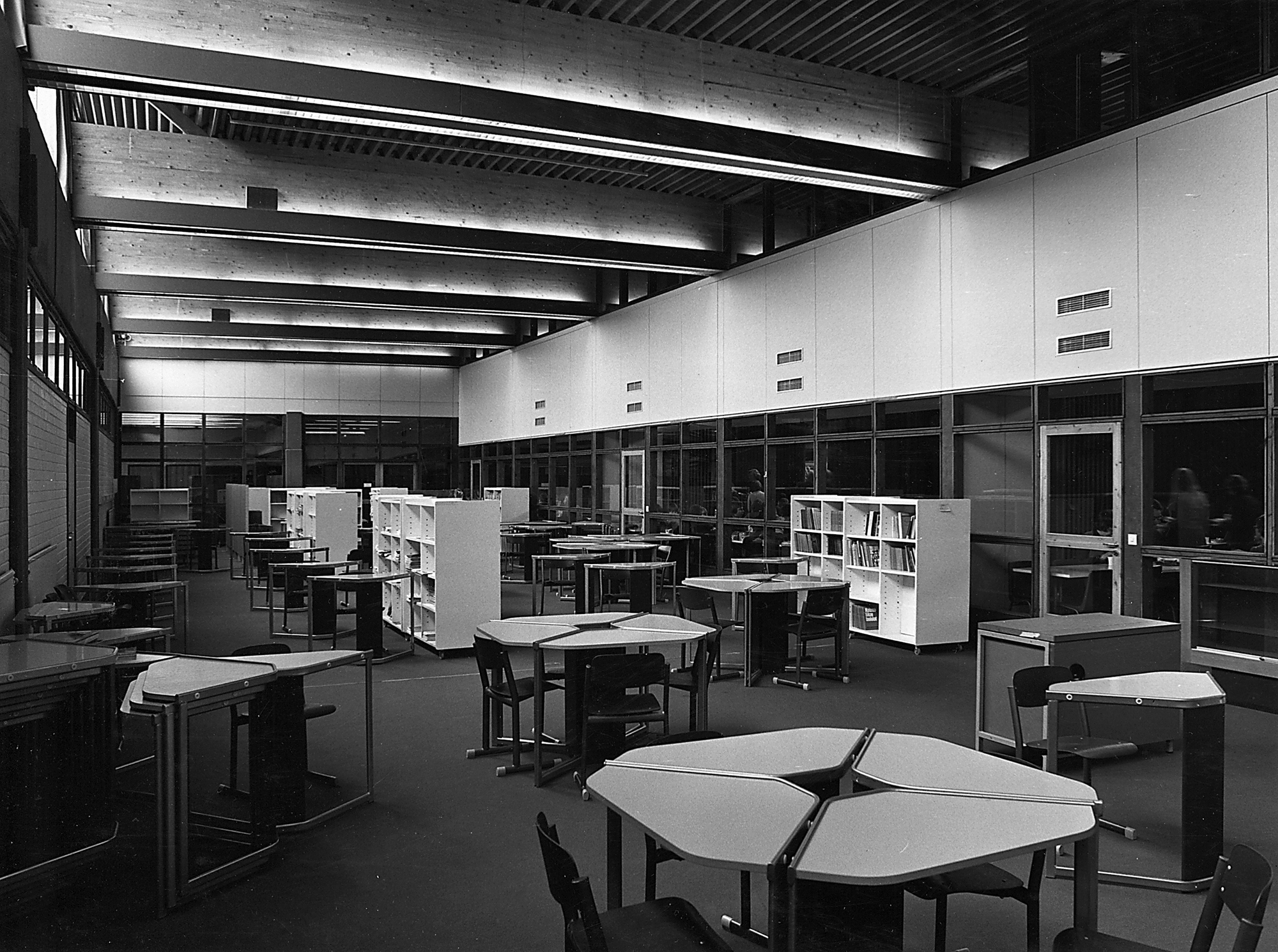 Arno Savela: Koulukeskus, Kankaanpää 1977. Kirjasto, jota voivat käyttää myös muut kuin koulun oppilaat. Kuva: Jukka Riihelä, Arkkitehtuurimuseo.