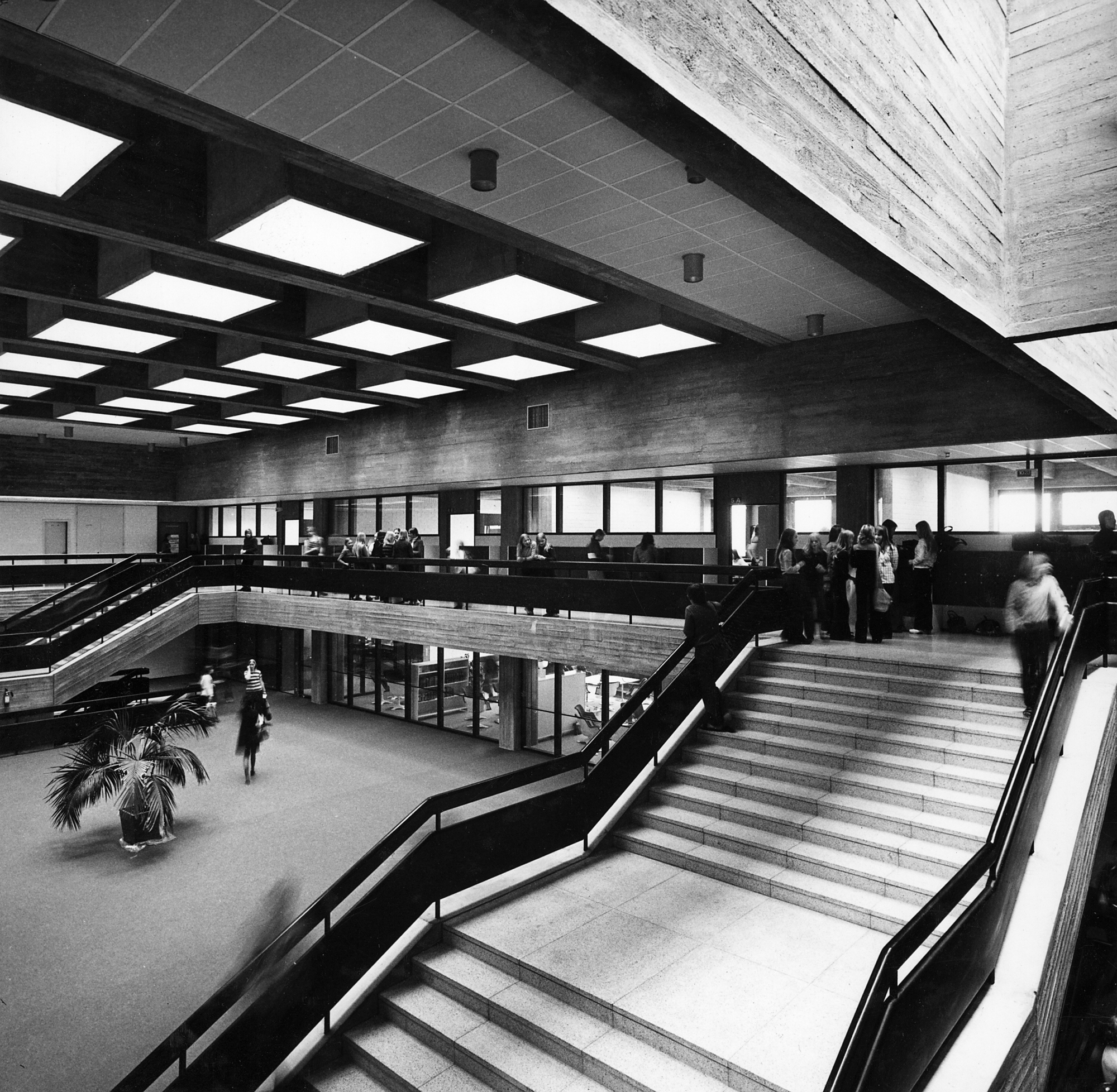 Kaija ja Heikki Siren: Helsingin Suomalainen Yhteiskoulu, Helsinki 1972. Kaksikerroksinen keskushalli, joka on valaistu kattoikkunoiden kautta. Kuva: Pentti Sammallahti, Arkkitehtuurimuseo.