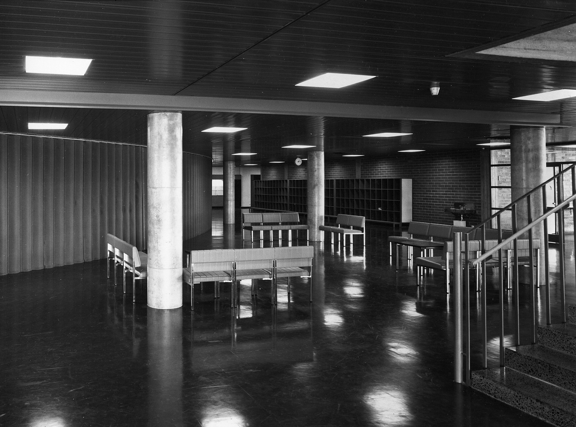 Osmo Lappo: Sylvään koulu, Vammala 1973. 1970-luvun kouluihin suunniteltiin auditoriot, joita myös koulun ulkopuoliset tahot voivat käyttää. Kuva: Simo Rista, Arkkitehtuurimuseo.