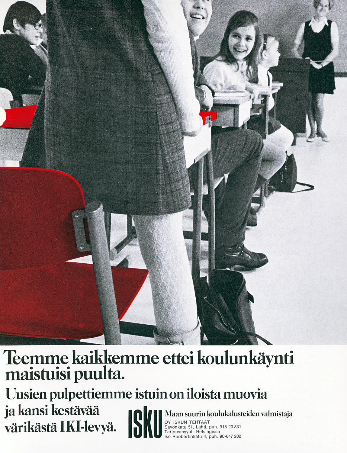 Koulujen pulpeteissa ja tuoleissa käytettiin kirkkaita värejä. Kuvalähde: Iskun mainos Arkkitehti-lehdessä 7/1971.