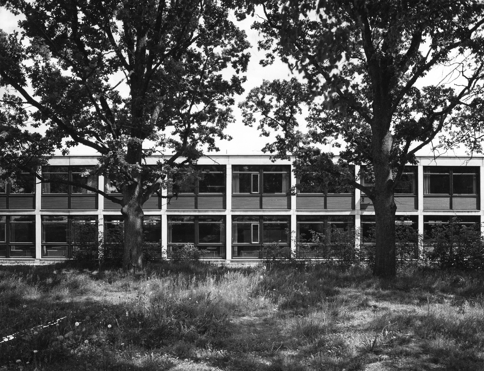 Osmo Sipari ja Kyösti Venermo: Vapaaniemen yhteiskoulu, Espoo 1970. Julkisivussa näkyy pilari-palkki -runko. Kuva: Simo Rista, Arkkitehtuurimuseo.
