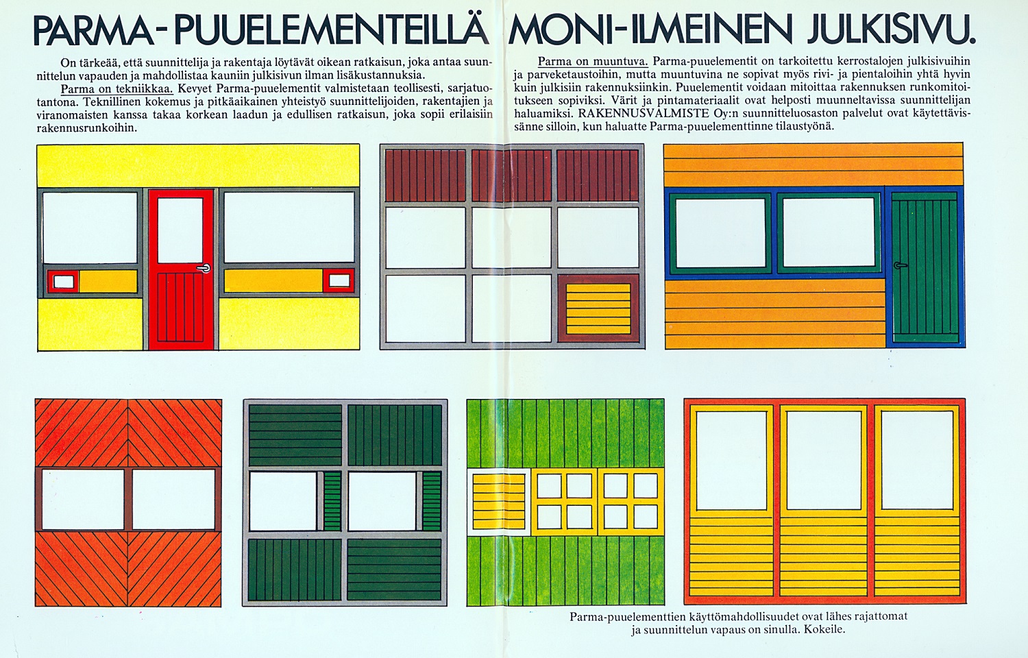 Julkisivuja elävöitettiin erivärisillä puuelementeillä. Kuvalähde: Parman mainos Arkkitehti-lehdessä 1/1978.