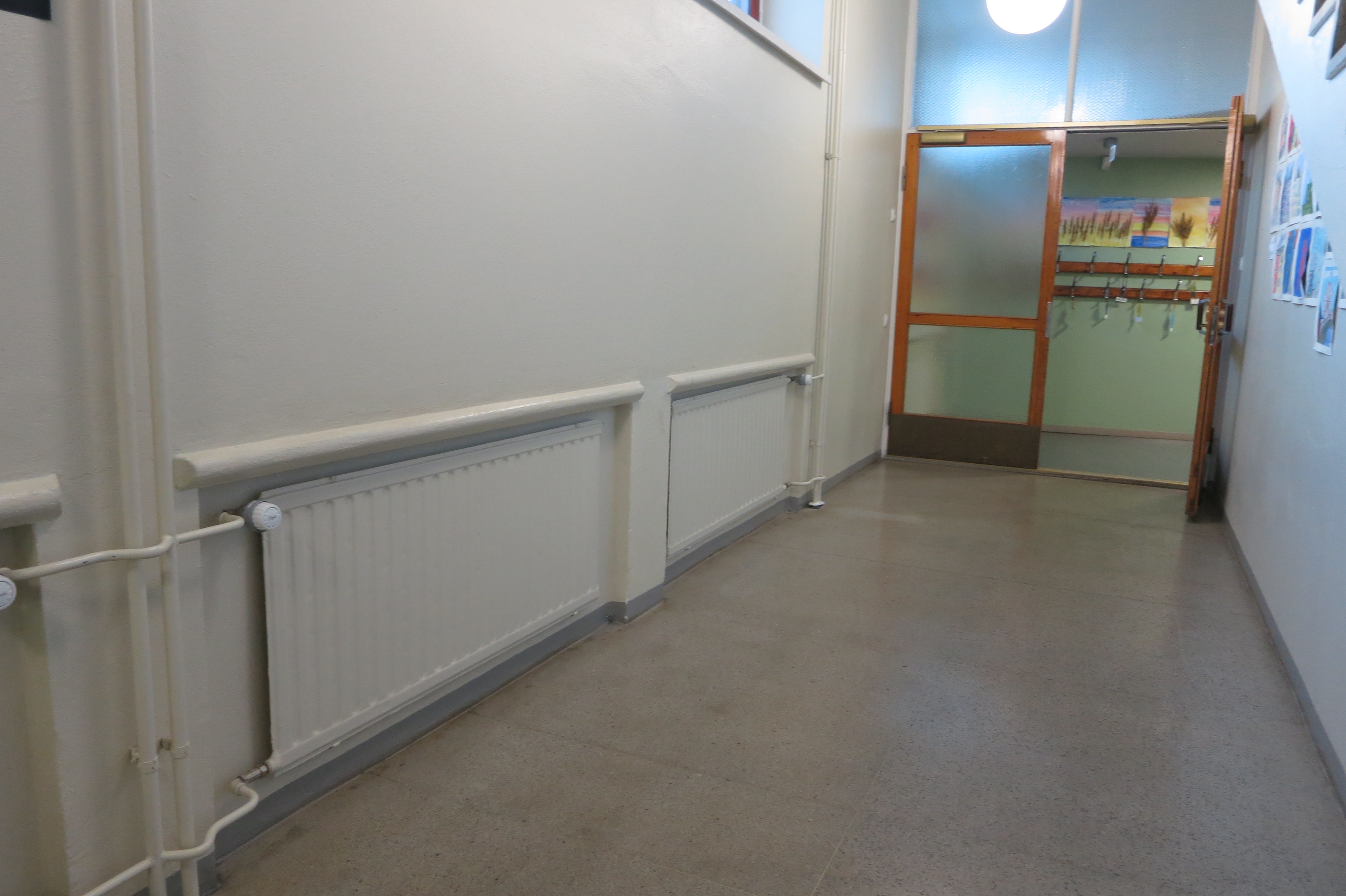 Komea alkuperäinen patteri Hertsikan ala-asteen aulan portaikossa. Kuva: Jukka Sainio.