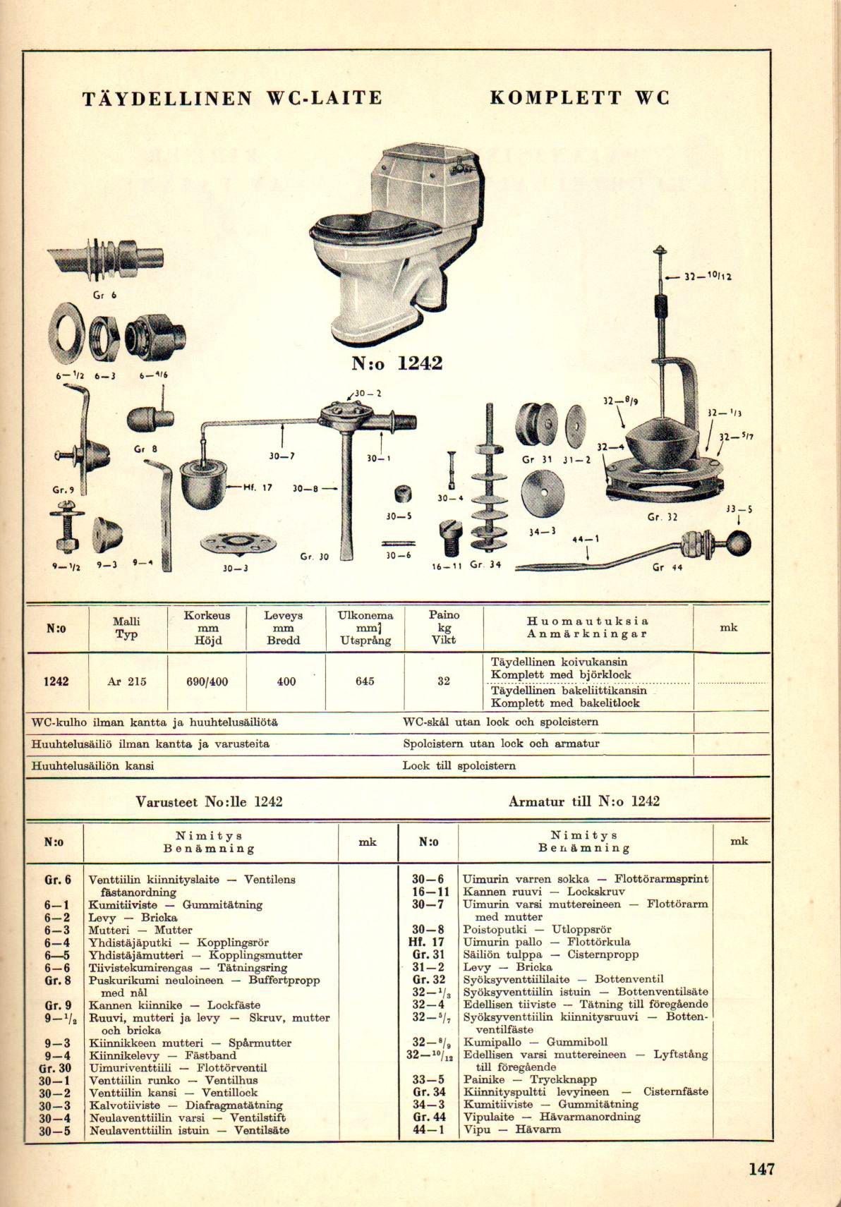 Täydellinen WC-laite osineen, Yleisluettelo 1952.