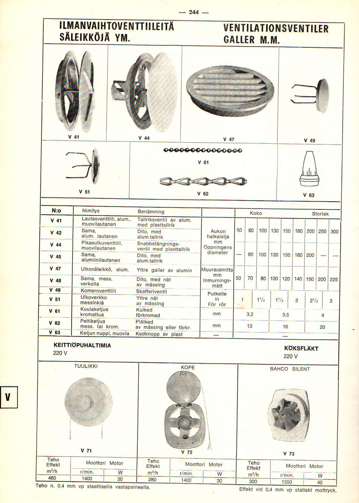 Puhaltimia keittiön poistoilmakäyttöön, Yleisluettelo 1952.