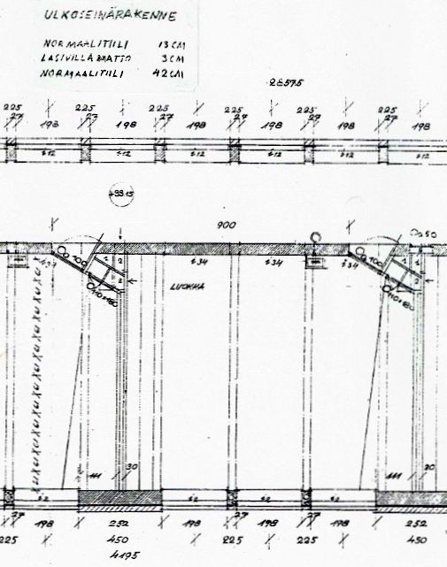 Alkuperäinen hormiryhmä luokkasiivessä Hertsikan ala-asteen koulussa. Hormiryhmissä päällekkäisten luokkien ja käytävien poistohormit. Alkuperäinen piirustus.