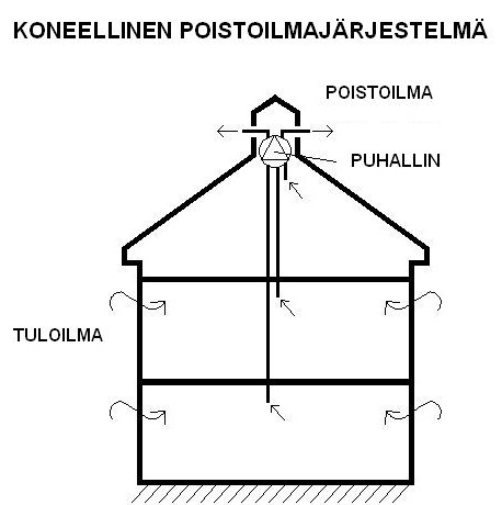 Koneellinen poistoilmanvaihto on lämpötilaeroista ja tuulen aiheuttamista painevaihteluista riippumaton järjestelmä. Ilma vaihtuu vain koneiden ollessa käynnissä. Koneellinen poistoilmanvaihtojärjestelmä edellyttää kelvollisia korvausilmajärjestelyitä. Koulurakennuksissa korvausilmaventtiileitä asennettiin vain harvoin 1950–1980-lukujen välisenä aikana. Tyypillistä oli luottaa poistoilmakojeilla alipaineistetuissa tiloissa siihen, että korvausilma eli raitis ulkoilma virtaa sisään ikkuna- ja rakennerakojen kautta. Kun korvausilma ei puhtainta reittiä eli tiivistämättömien ikkunoiden kautta toiminut riittävästi, luotiin olosuhteet ilman kulkeutumiselle rakenteista ja mm. alapohjan kautta alustatilasta. Energiaa pyrittiin säästämään käyttämällä koneita vain varsinaisen koulupäivän ajan. Välituntien aikainen ikkunatuuletus oli yhä toimiva malli, jatkumoa edellisiltä vuosikymmeniltä. Koneellista tuloilmaa ei ollut tai se oli puutteellista. Ensimmäiset edellytykset sisäilmaongelmille oli luotu.