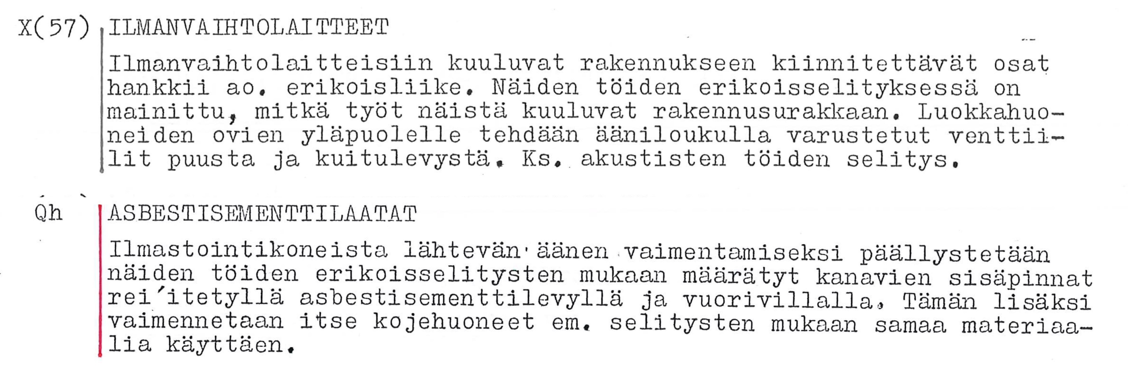[5] Lämpö-, vesijohto- sekä tuuletustekniikan käsikirja 1959, 429, 431. Ilmanvaihdon tehtävät: ”Tuoda huoneessa oleville ihmisille hengitysilmaa. Ilmamäärä, joka tarvitaan hengitykseen on niin pieni, että se hyvin harvoin vaatii mitään tuuletusta. Yleisimmän poikkeuksen muodostavat väestönsuojat. Viedä pois epämiellyttäviä hajuja, jotka aiheutuvat huoneissa olevista henkilöistä tai siellä suoritettavasta työstä. Tämä on tavallisin tuuletusta vaativa syy. Viedä pois lämpöä, jota kehittyy ihmisissä, koneissa, lämpölaitteissa tai jota tulee ulkoa auringon säteilyn tai ulkoilman lämpenemisen johdosta. Viedä pois kosteutta, jota ihmiset tai huoneessa suoritettava työ kehittävät. Korvata ilmaa, jota imetään ulos laitteista ja koneista niissä syntyvien kaasujen ja jätteiden poiskuljettamiseksi.”