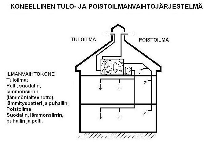 Koneelliset tulo- ja poistoilmajärjestelmät olivat 1970-luvulla vielä yksinkertaisia, vain aivan välttämättömällä automatiikalla varustettuja. Koneissa oli kaksinopeuspuhaltimet, jolloin koneet kovilla pakkasilla ohjautuivat puolelle teholle. Koulupäivän päättyessä ilmanvaihto pysäytettiin ja käynnistettiin jälleen hieman ennen koulupäivän alkua. Pysäyttämällä ilmanvaihto pyrittiin säästämään sähköenergiaa (ilmanvaihtokojeiden sähkömoottorit) ja lämmitysenergiaa (kylmän ulkoilman lämmittäminen). Tämäkin toimintamalli on myöhemmin nähty yhdeksi sisäilmaongelmien aiheuttajaksi.