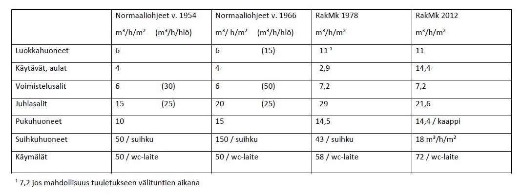 Seuraavassa on vertailtu ”Lämmitys ja ilmanvaihtolaitteiden suunnittelun normaaliohjeet” ensimmäisen (1954) ja toisen painoksen (1966) sekä Rakentamismääräyskokoelman osan ”D2 Rakennusten ilmanvaihto” vuodelta 1978 ohjeistuksia koulurakennuksen mitoitusilmamääristä [2]. Ilmanvaihdon suuruus määrätään joko huoneen käyttötarkoituksen, henkilöluvun, lattiapinta-alan tai huoneen tilavuuden perusteella.