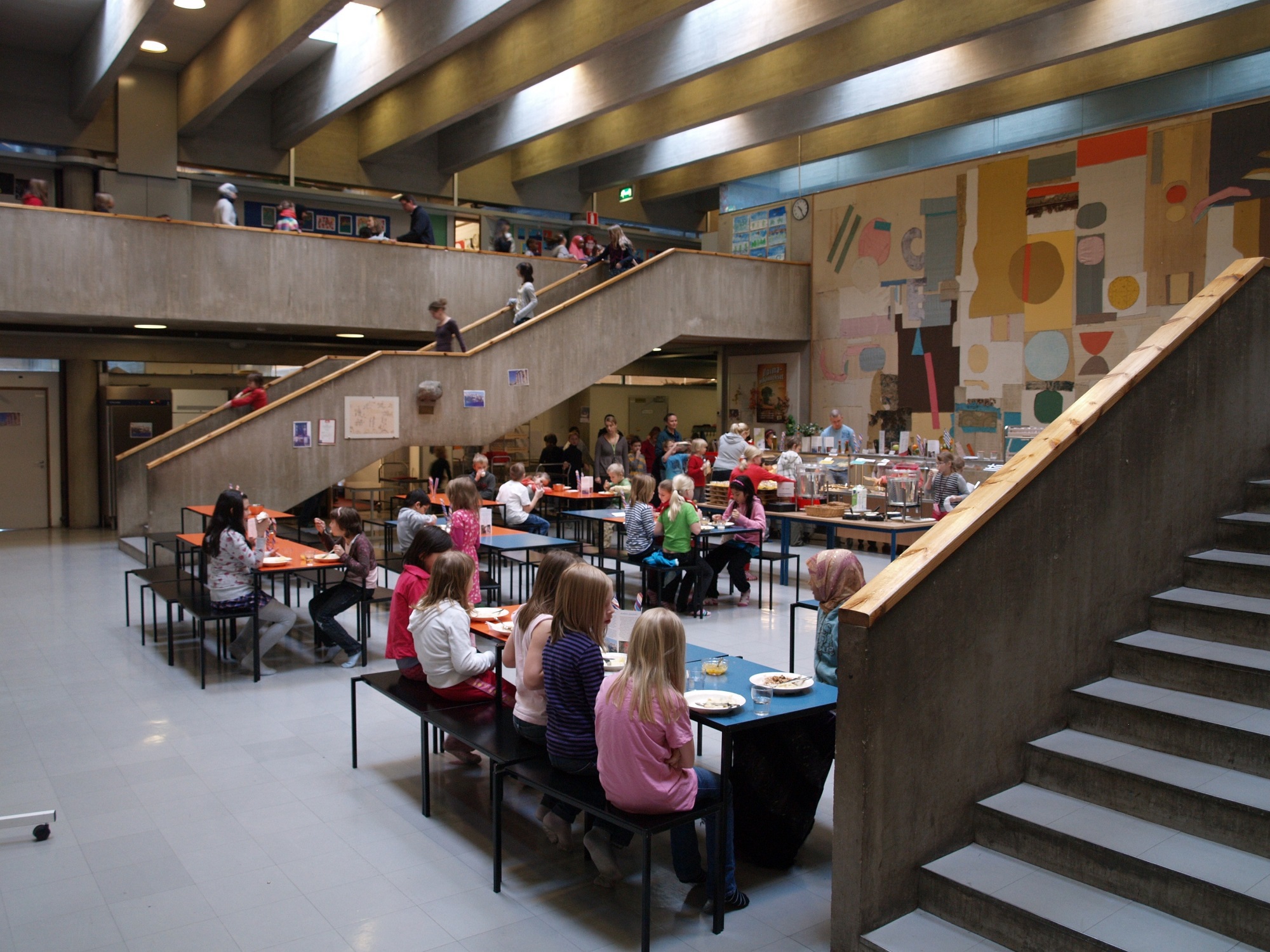 Roihuvuoren alakoulun sydämen muodostaa keskushallin ruokasali, jonka seinää koristaa taiteilija Anitra Lucanderin suurikokoinen applikaatio. Kuva: Mikko Lindqvist, Helsingin kaupunginmuseo.