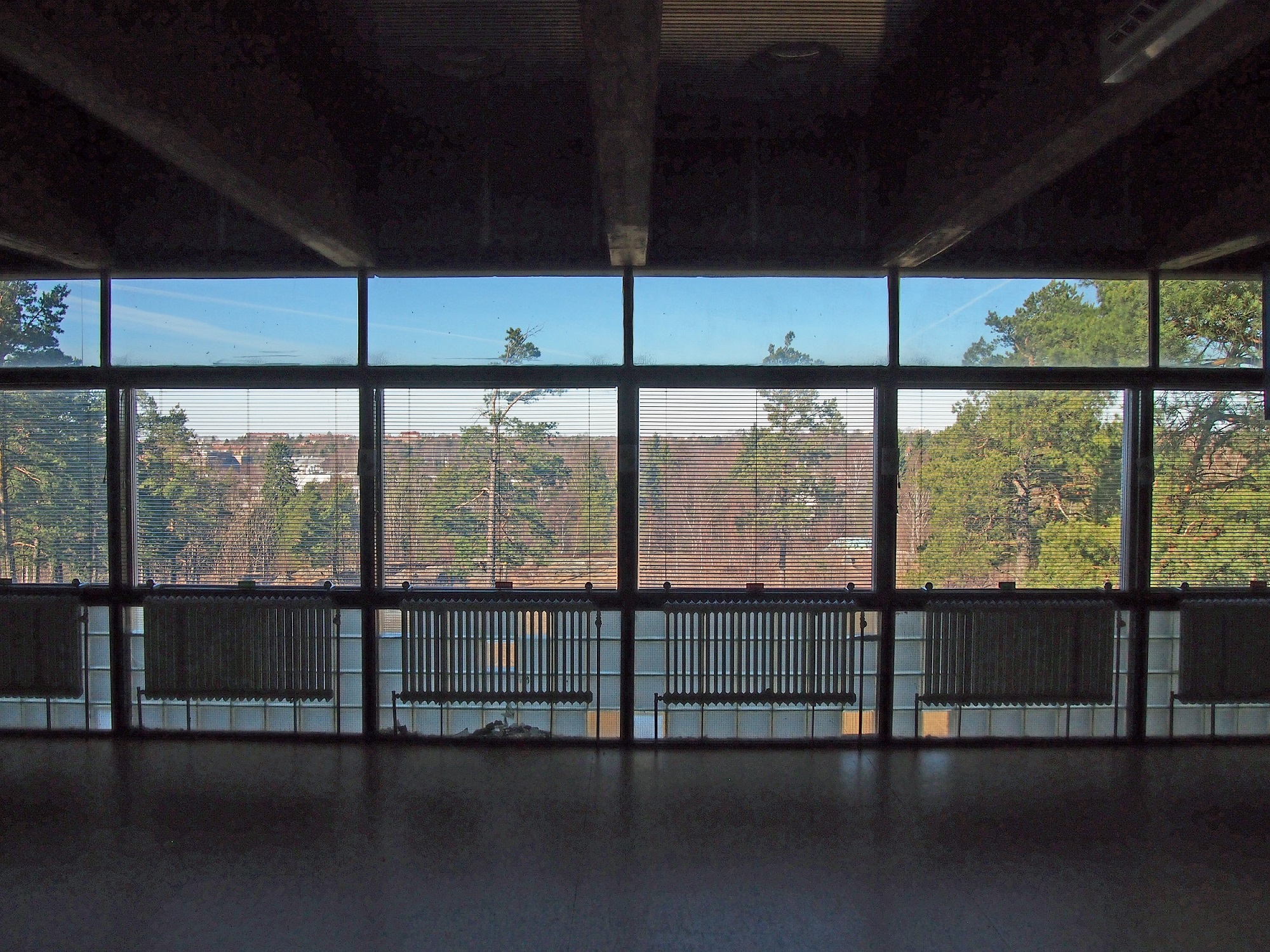 Roihuvuoren alakoulun valoisat luokat avautuvat yhtenäisin lasirakentein ympäröivään metsäpuistoon. Rikkoutuneet lasitiilet oli korvattu erilaisilla lasitiilillä. Välitilaan jäänyttä lasimursketta ei voitu poistaa, sillä huoltomahdollisuus puuttui. Kuva: Mikko Lindqvist, Helsingin kaupunginmuseo.