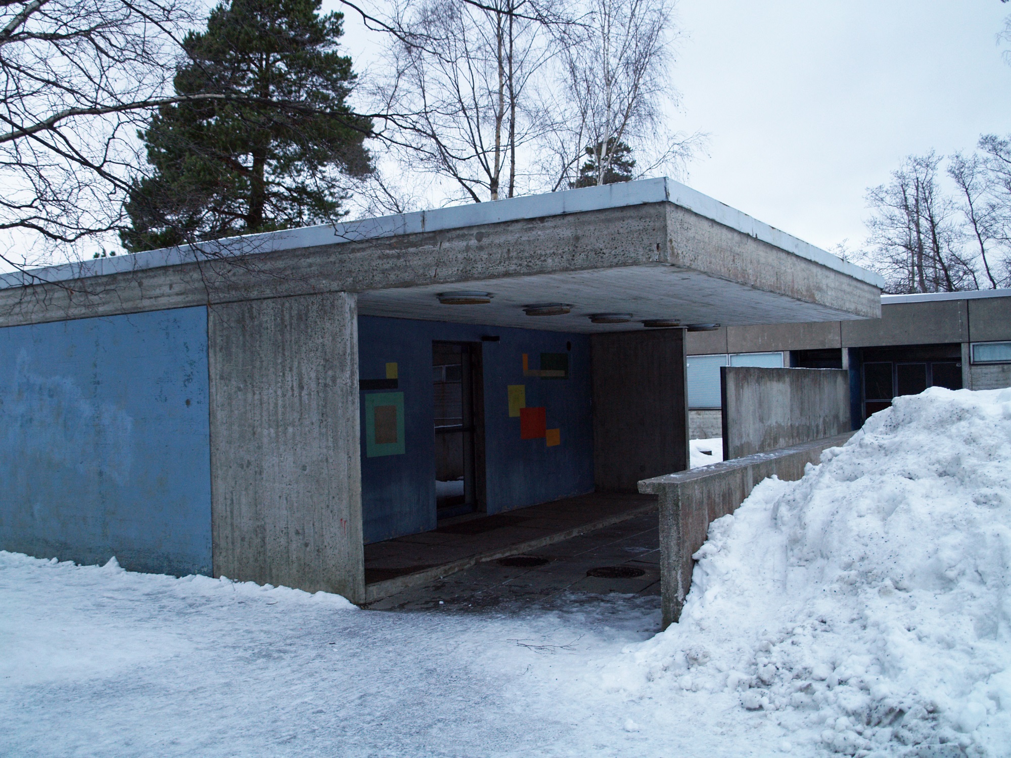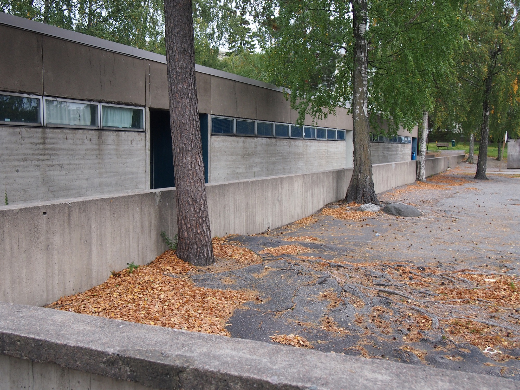 Roihuvuoren koulun yhteyteen rakennetut neuvola ja terveystalo eli ns. Kotkansiipi kuului koulupihan sommitelmaan. Rakennus purettiin, mutta siihen liittynyt betonimuuri säilytettiin, ja siitä voi yhä päätellä alkuperäisen tilajaon. Kuva: Mikko Lindqvist, Helsingin kaupunginmuseo.