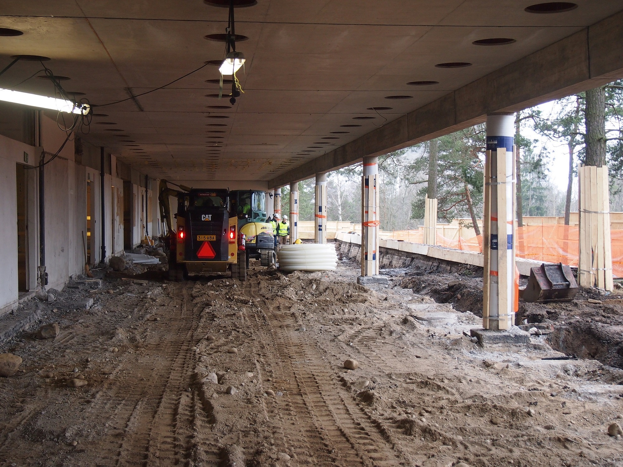 Roihuvuoren koulun ulkoseinä- ja alapohjarakenteet uusittiin. Säilyvät rakennusosat ja puusto suojattiin huolellisesti, paitsi alakatot, jotka nekin säilyivät vahingoittumattomana työmaan ajan. Kuva: Mikko Lindqvist, Helsingin kaupunginmuseo.