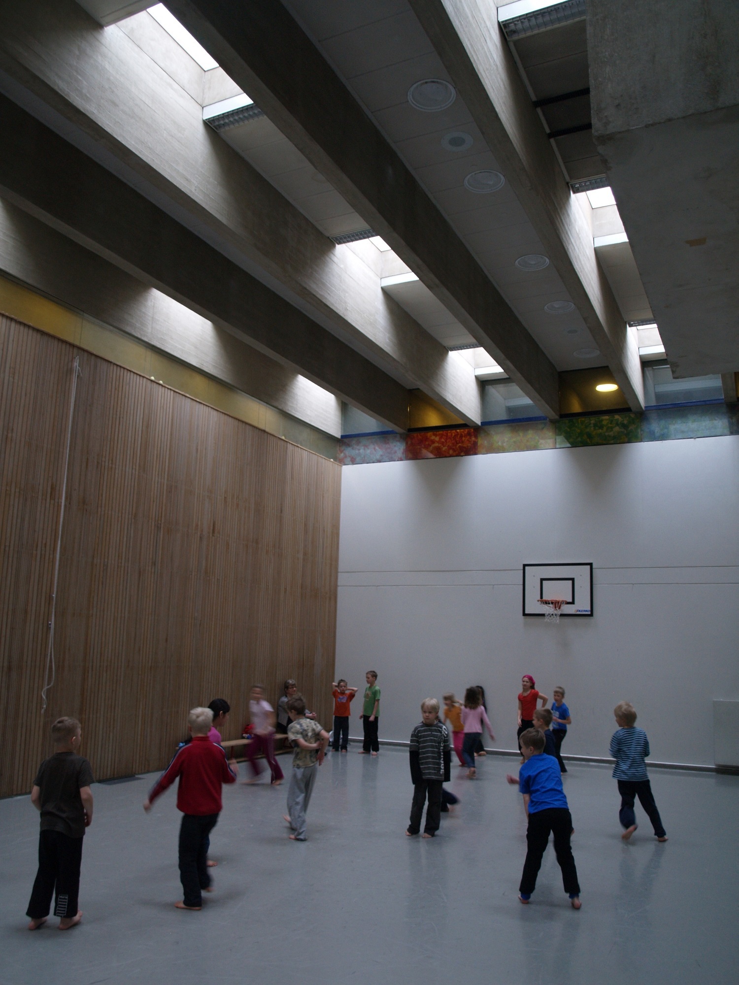Roihuvuoren koulun pieni kerho- ja liikuntasali alkuperäisessä käytössä. Tilaan sijoitettiin uusi ilmanvaihdon konehuone sekä uusi kokoustila. Kuva: Mikko Lindqvist, Helsingin kaupunginmuseo.
