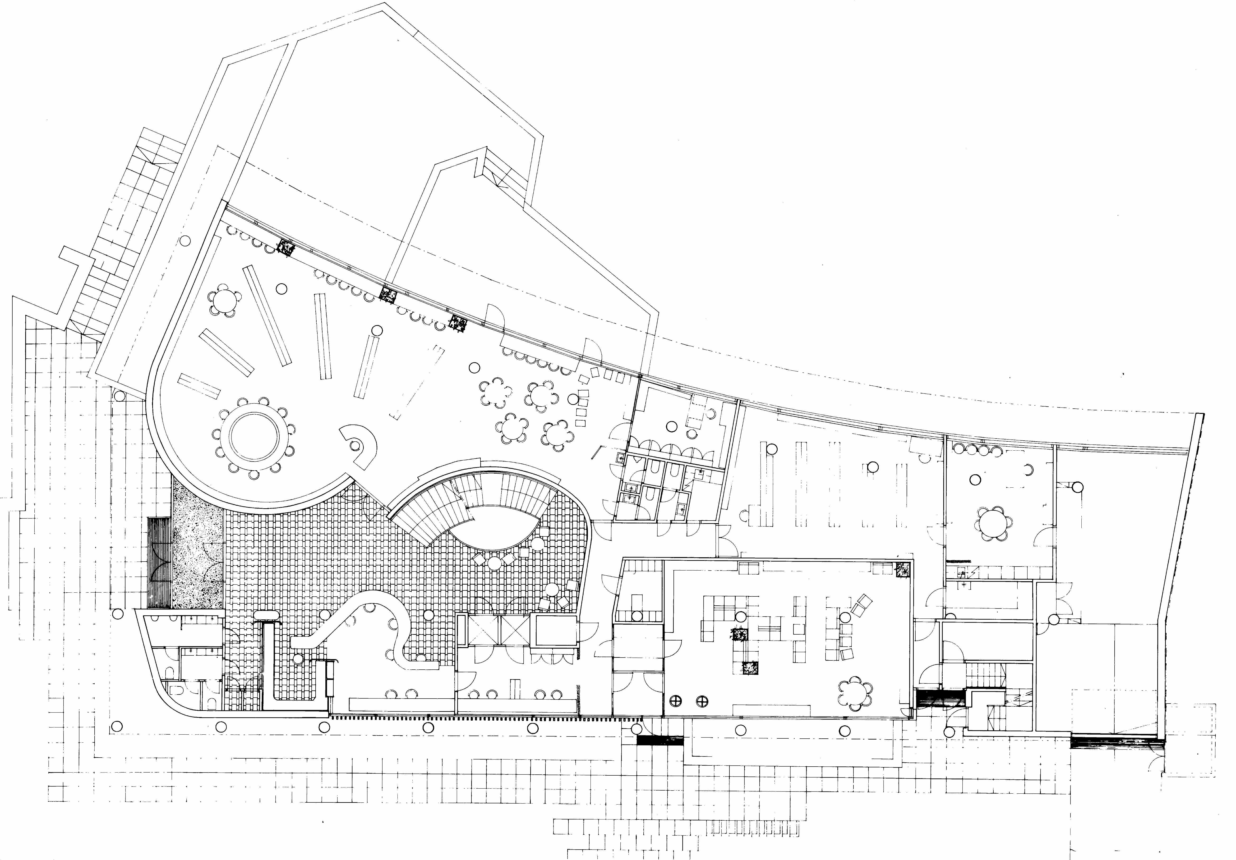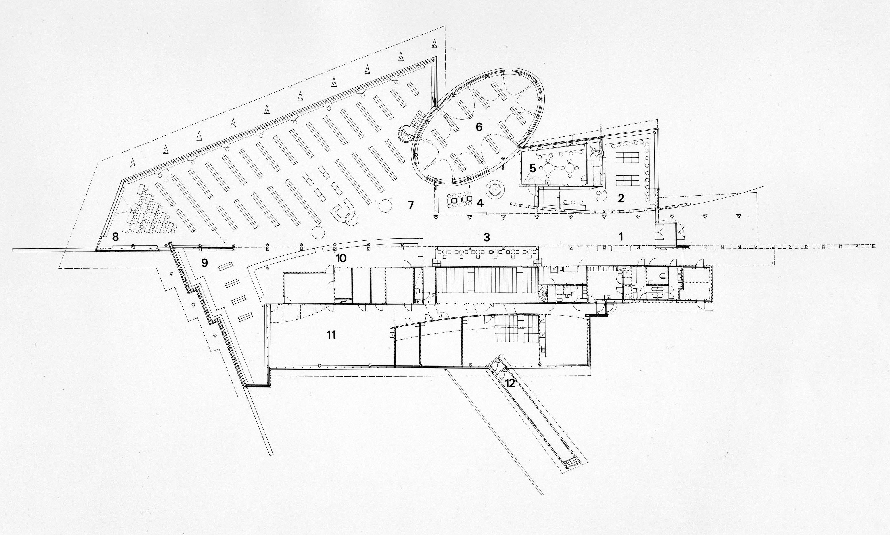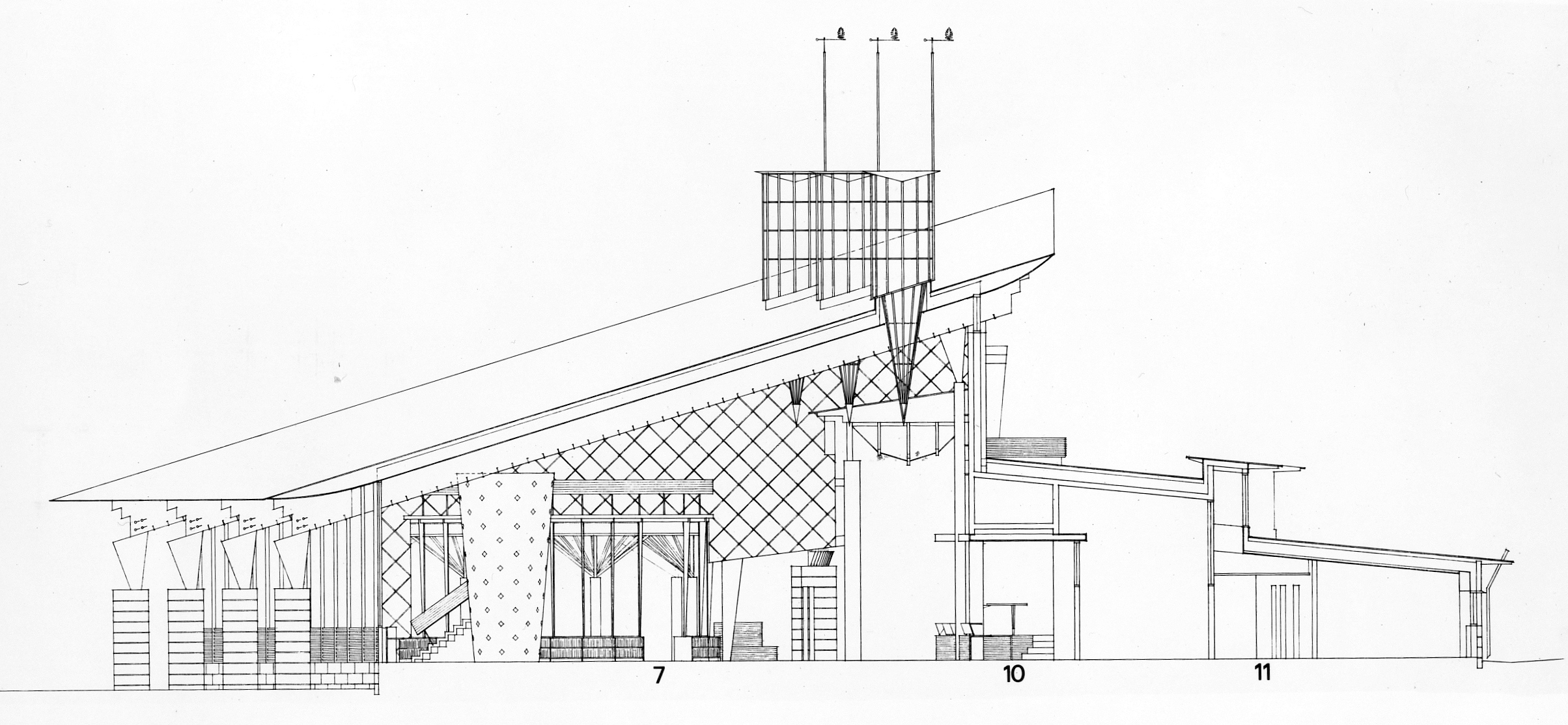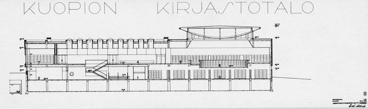 _Oik.: Kuhmon kirjasto (Jyrki Tasa / Nurmela-Raimoranta-Tasa, yleinen arkkitehtuurikilpailu 1984, valm. 1988). Leikkaus. Piirustus: Jyrki Tasa / NRT Arkkitehdit Oy.