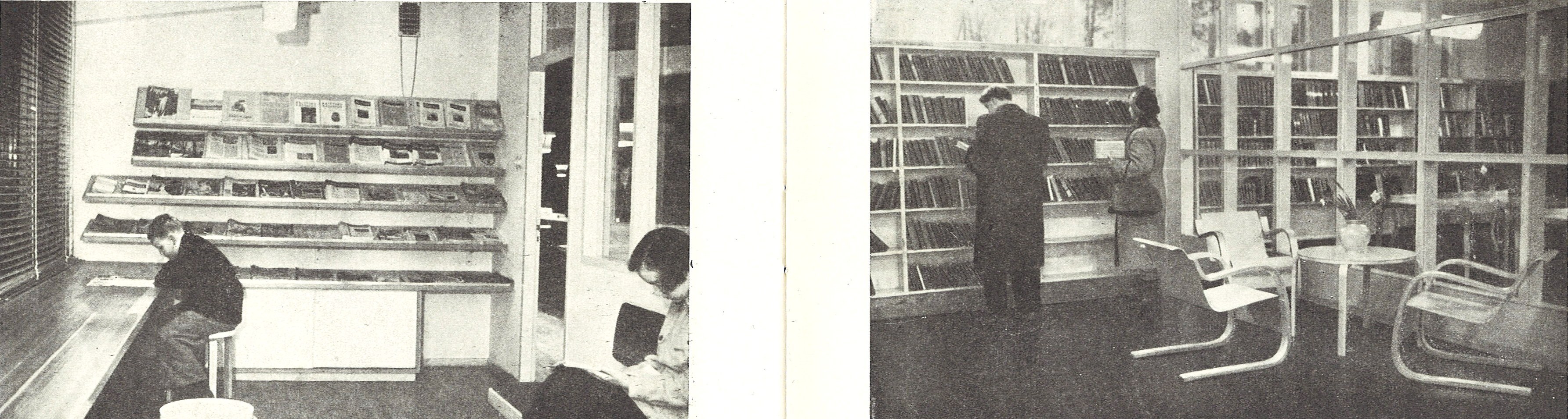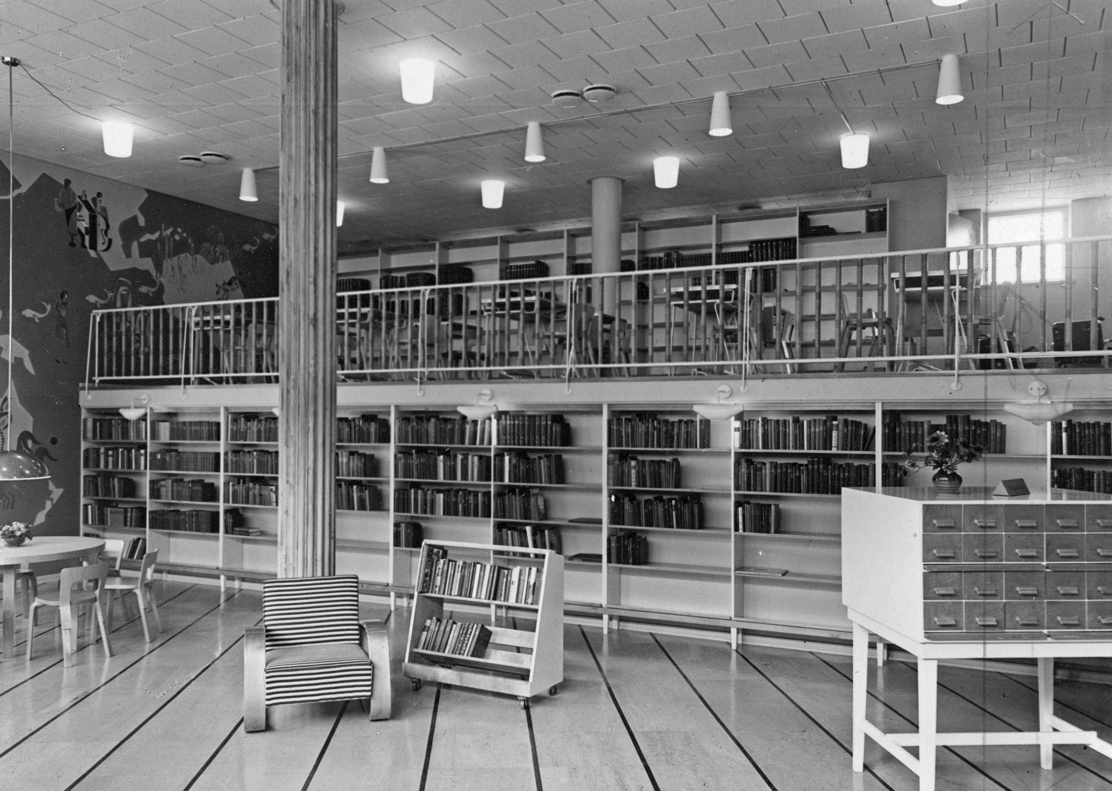 _Oik.: Näkymä Lauritsalan kirjaston lainaussaliin (Arkkitehtuuritoimisto Martikainen–Ypyä–Malmio, 1951). Kuva: Kuvapaja, Arkkitehtuurimuseo.
