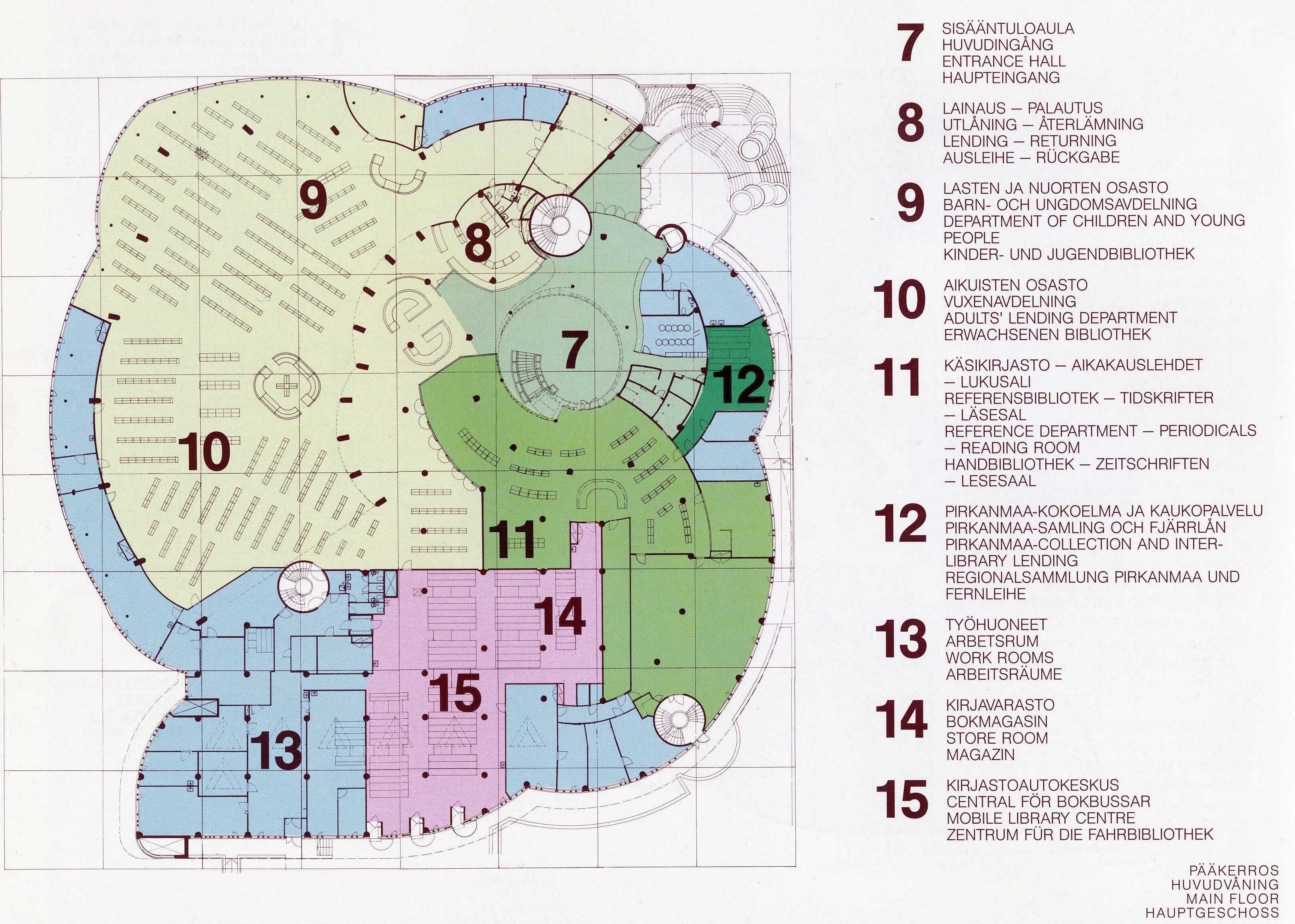 Kirjaston tilat ovat neljässä kerroksessa, ja kaikilta osastoilta avautuu näkymiä kaupunkiin tai jokisuistoon. Pohjakerroksessa ovat yleisöpalvelutilat ja lehtisali; kahdessa seuraavassa sijaitsevat aikuisten ja lasten osastot, opintosali sekä kokoelma- ja työtiloja; kirjavarasto ja henkilökunnan tilat ovat ylimmässä kerroksessa. Sisätilojen sydän on koko rakennuksen korkuinen keskusaula veistoksellisine betoniportaikkoineen. Alkuperäinen sisustus sovitettiin taidokkaasti tehostamaan rakennuksen ilmavaa tunnelmaa ja auttamaan suuren kirjaston eri osastojen hahmottamista.