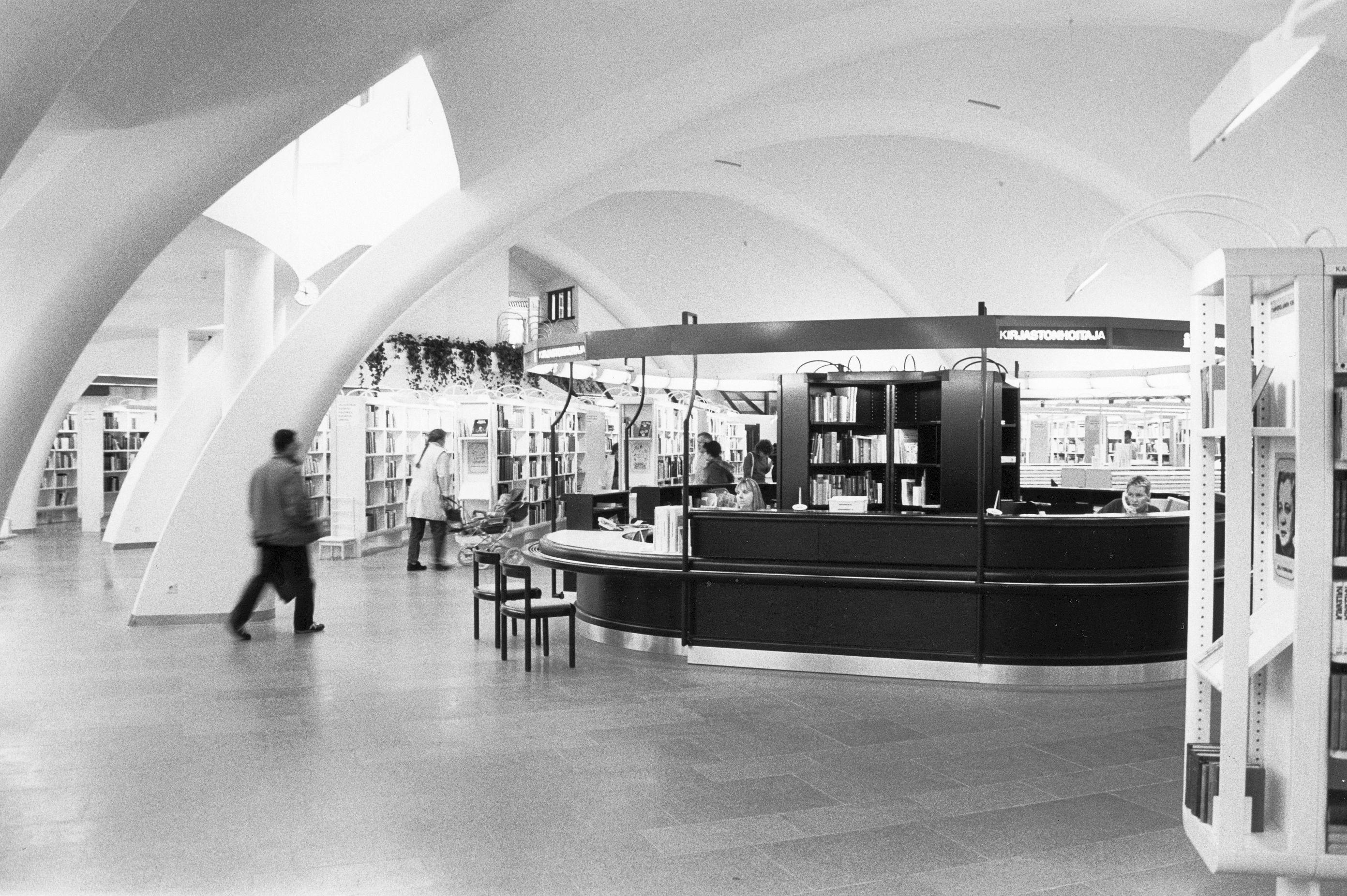_Oik.: Tampereen pääkirjasto Metso (Raili ja Reima Pietilä, yleinen arkkitehtuurikilpailu 1978, valm. 1986), kirjastonhoitajan tiski. Kuva: Maija Kanerva, Tampereen kaupunginkirjaston arkisto.