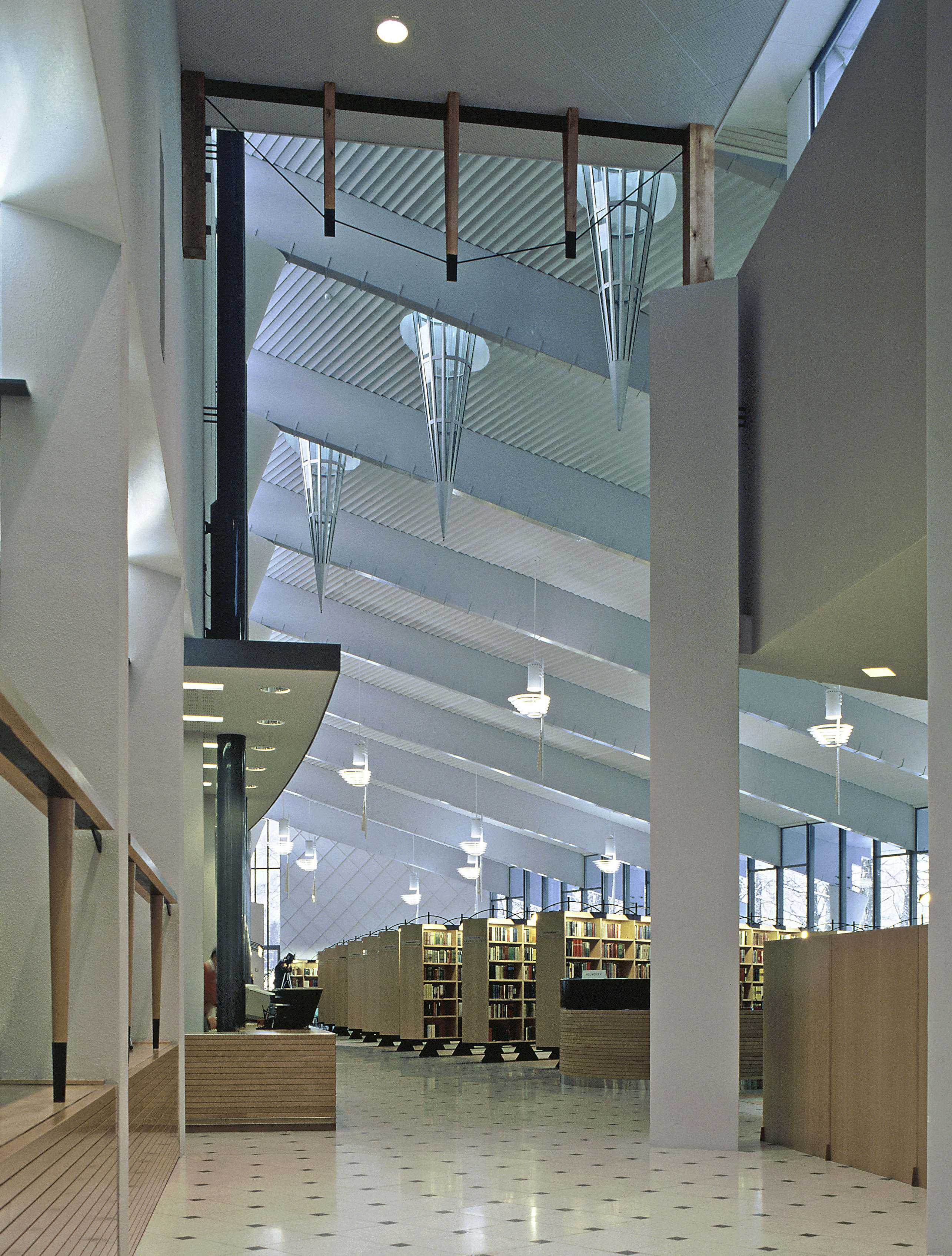 _Oik.: Maaningan kunnantalon kirjasto (Hannu Huttunen, yleinen arkkitehtuurikilpailu 1988, valm. 1992). Sisänäkymä kirjasto-osaan. Kuva: Anni Vartola, 2014.