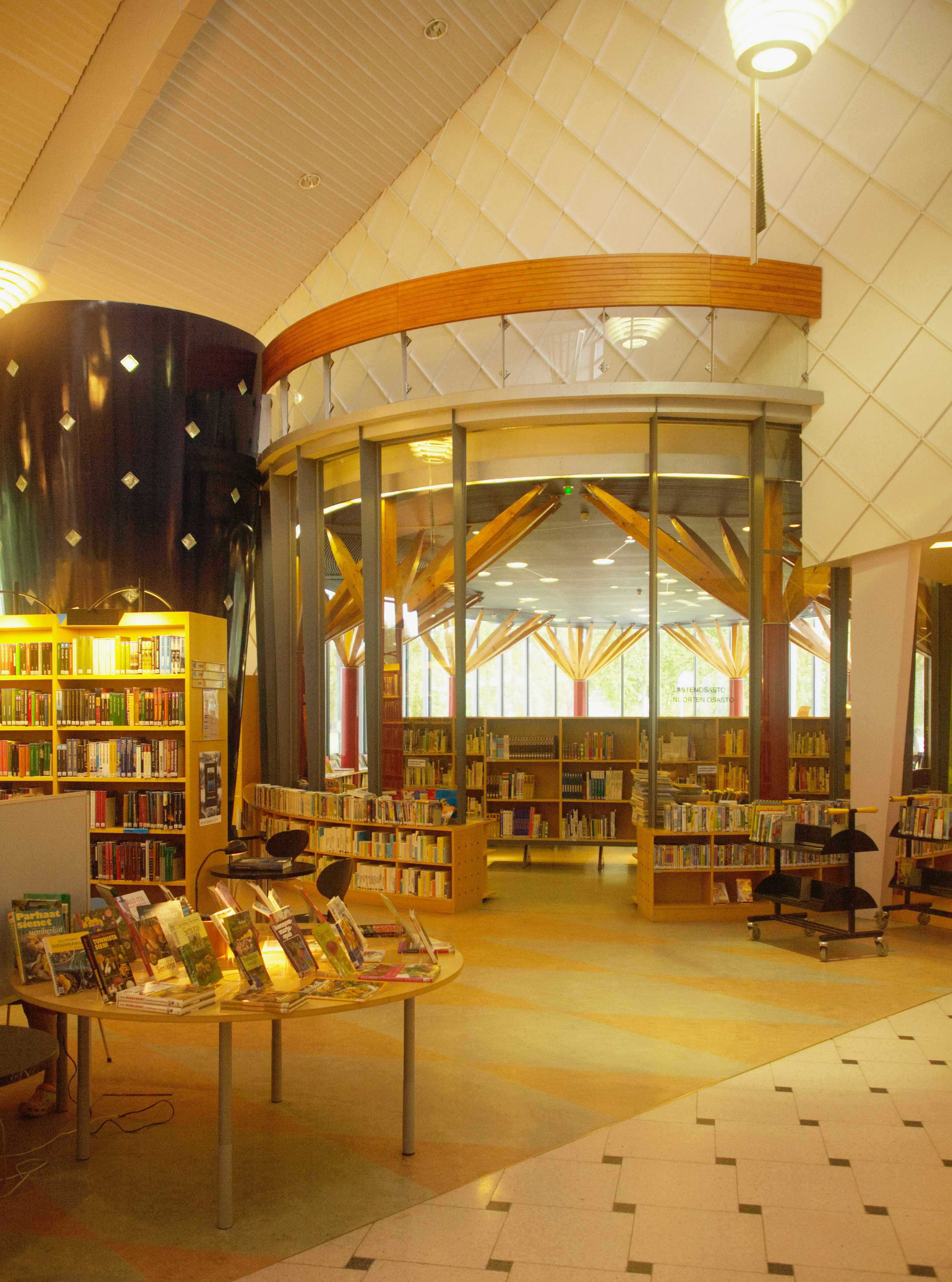_Oik.: Kuhmon kirjasto (Jyrki Tasa / Nurmela-Raimoranta-Tasa, yleinen arkkitehtuurikilpailu 1984, valm. 1988) lastenosasto. Vasemmalla portaikko satuparvelle, keskellä näkymä lastenosaston pyöreään tähtikattotilaan. Kuva: Anni Vartola, 2014.