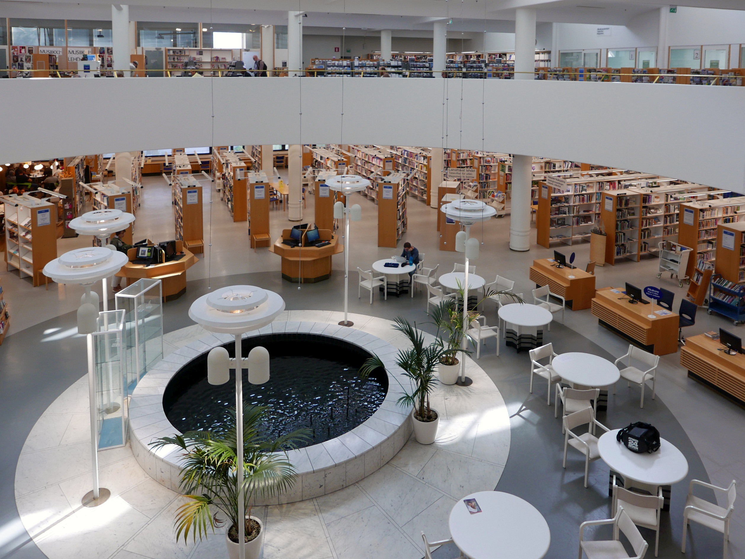 _Oik.: Sisäsuihkulähde on Helsingin pääkirjaston kaksikerroksisen lainaussalin keskipiste. Kuva: Anni Vartola.