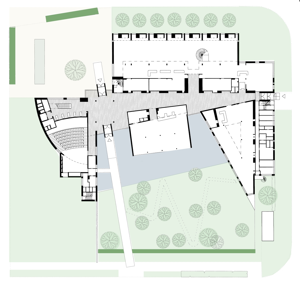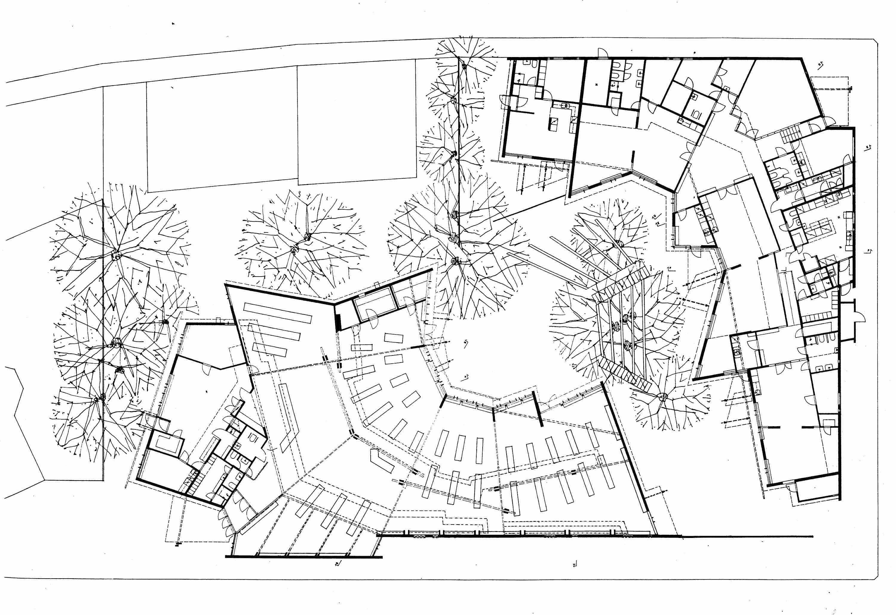 _Oik.: Vallilan kirjasto ja päiväkoti, Helsinki (Juha Leiviskä & Asta Björklund, 1990). Kirjasto (alhaalla vasemmalla) ja päiväkoti (ylhäällä oikealla) ovat samassa pihapiirissä Vallilan puutalokortteleiden keskellä. Piirustus: Helander Leiviskä Arkkitehdit.
