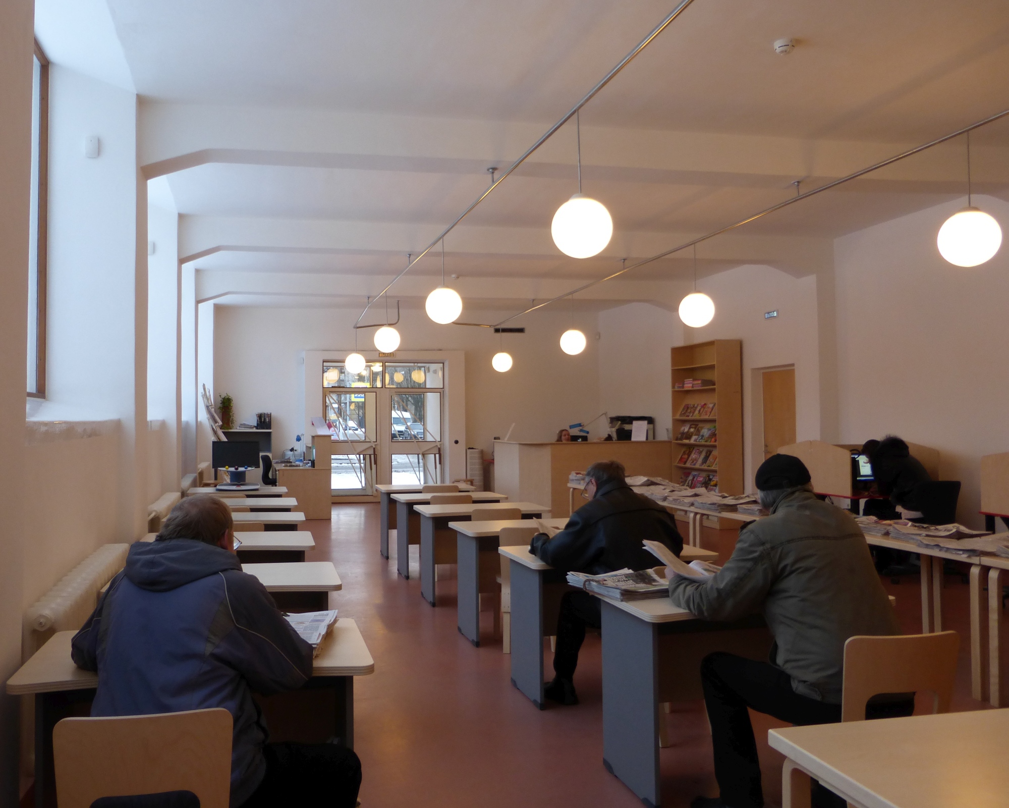 Seinäjoen ja Rovaniemen kirjasyvennysten kolmionmuotoisista osista kootuissa lukupöydissä on messinkiset pöytälamput, jotka keskittävät valon olennaiseen, kirjoihin ja lukemiseen. Ne levittävät ympärilleen lämpimän sävyisen valokehän. Lukutasot kirjasyvennysten reunoilla saivat omanlaisensa kohdevalaisimet.