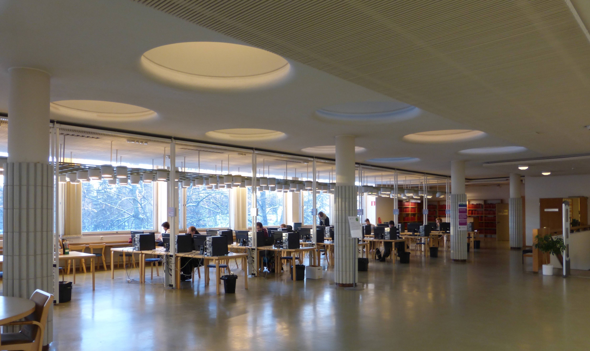 Erimuotoiset kattolyhdyt ja yläikkunoista valonsa sieppaavat holvipinnat ovat Otaniemen pääkirjaston lainauskerroksen selkäranka ja osoittavat tilan toiminnallisesti erilaisia vyöhykkeitä. Seinäjoen kirjaston kirjastosalissa vaakasuuntaiset ulkosäleet siivilöivät auringonsäteet leikkisiksi kuvioiksi sisäseinille. Sielläkin kattopintojen holvimaiset muodot ovat tärkeä luonnonvaloa suuntavina. Epäsuora keinovalaistus korostaa holvien muotoa.